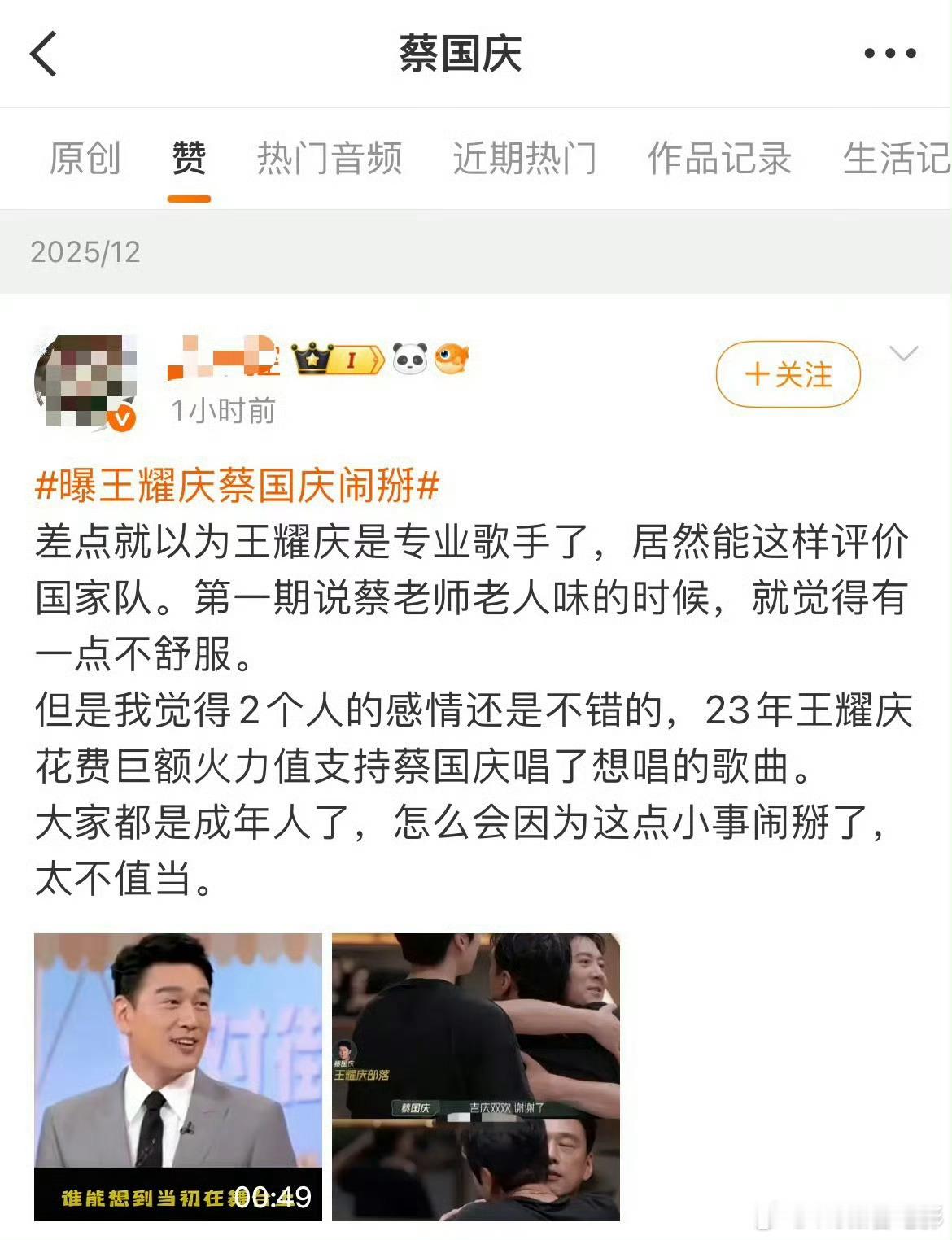 蔡国庆亲自下场了蔡国庆点赞了自己和王耀庆闹掰的内容之前看披荆斩棘的时候,还以为王