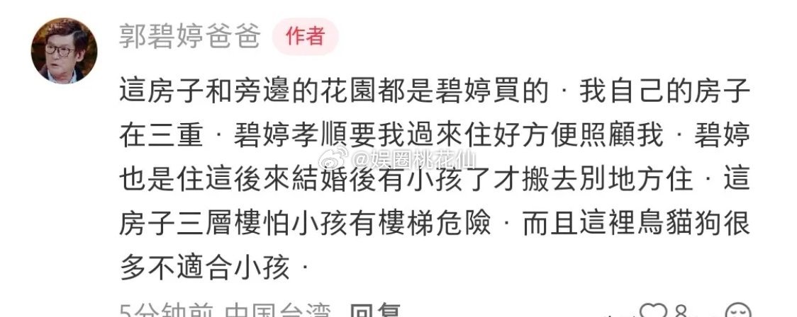 郭碧婷爸爸搬去女儿买的房子啦!三层别墅带花园,70岁的郭爸爸发文夸女儿特孝顺,住得近了,照顾起来也方便。本来这别墅是郭碧婷住的,后来结婚有了孩子就搬走了——里面有楼梯,附近还有鸟啊猫啊狗的,不适合俩孩子常住,就换了地方。别墅空出来就让老爸搬进去了,离郭碧婷新家特别近,平时看看孩子、带爸爸去医院啥的,都特方便。郭碧婷现在日子过得是真舒坦,不用应付公婆,把娘家爸爸也安顿得好好的,一儿一女也在身边,看着温柔,心里头可是个妥妥的大女主!