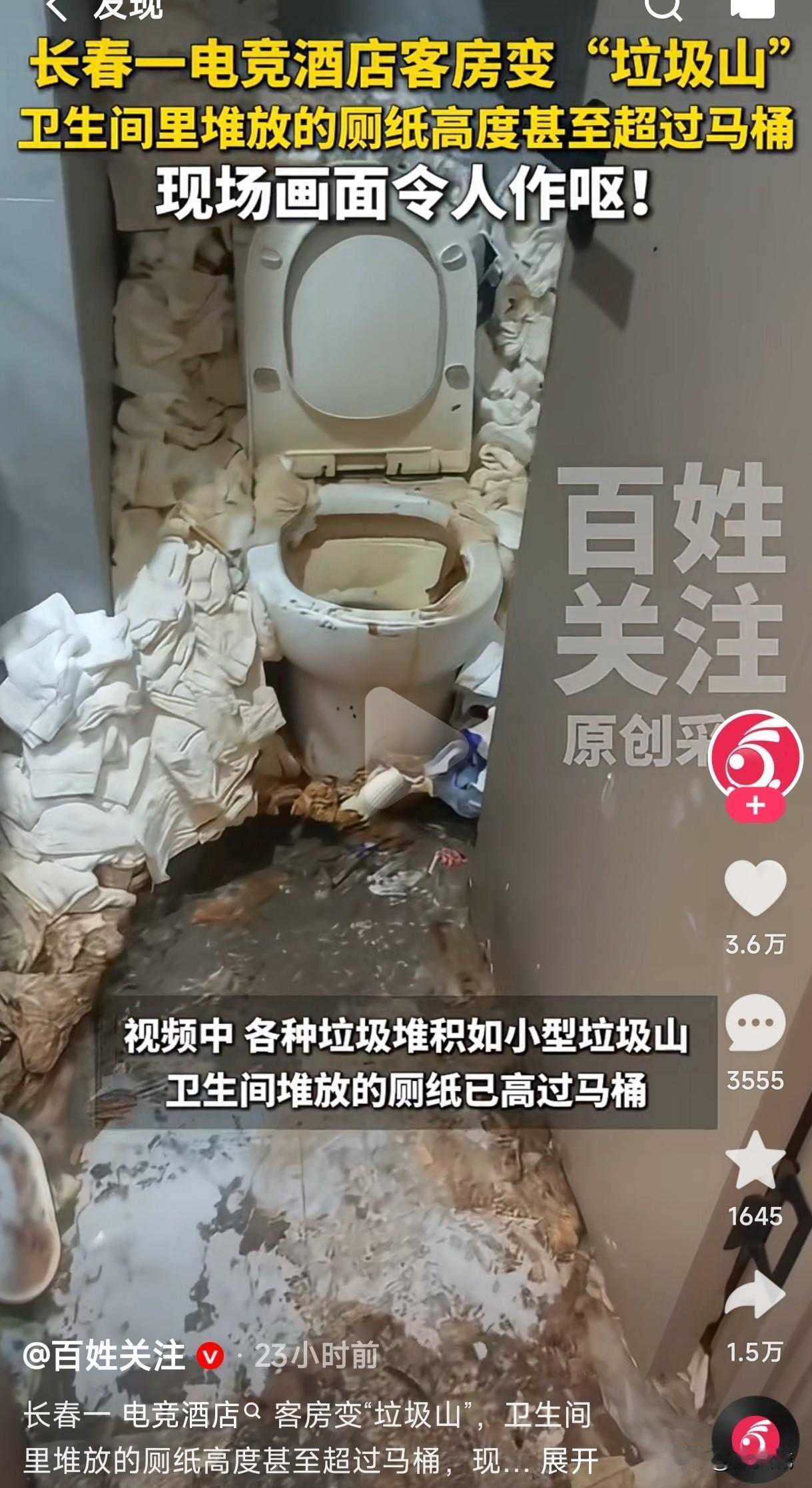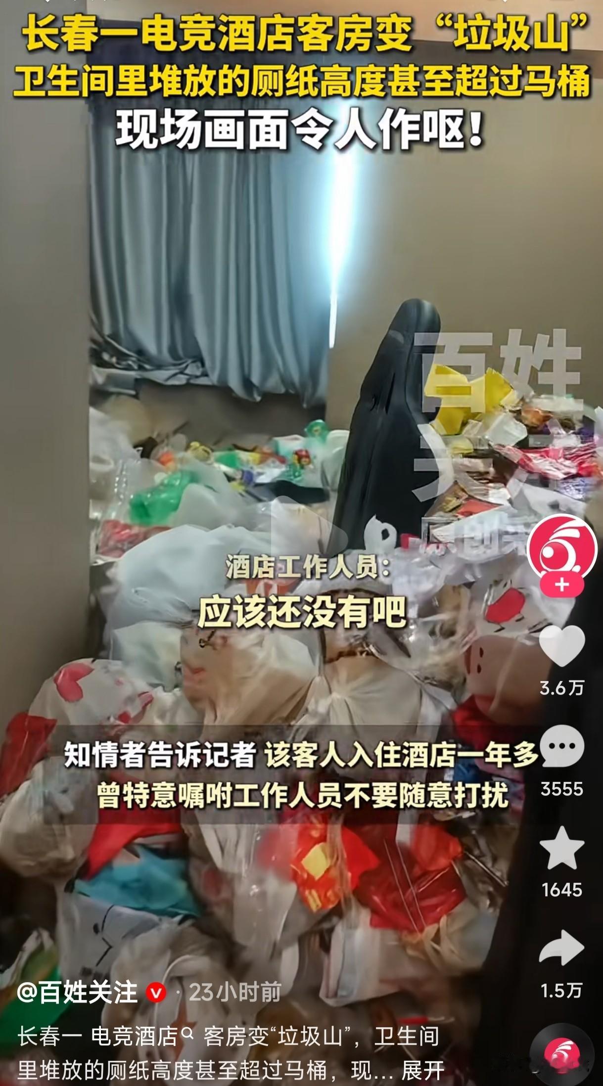 长春一电竞酒店客房变成垃圾山,卫生间里的厕纸高度甚至高过了马桶,这就是客人入住一年多特意嘱咐不让工作人员打扰的原因吗? 这酒店为了挣钱就如此相信客人吗?他入住一年多难道酒店的工作人员就从来没有进去检查过吗?甚至没有换过床单被套吗?还是说只要客人付过房费他就是爷,所有的一切他说了算,酒店按照他的要求遵循照做就是,这到底怪酒店轻信了客人的人品?还是怪这客人太缺德了? 酒店可能做梦都没有想到,入住一年多的客人退房时会出现这种令人作呕的一幕,他当初的那点押金够清理费吗?这钱挣的是不是太憋屈了?无论如何都没有想到客人千叮咛万嘱咐的要求不让打扰,居然是为了把房间搞成垃圾山,这客房的垃圾清理费用到底该谁来掏?这间被污染的客房是不是也要重新装修?