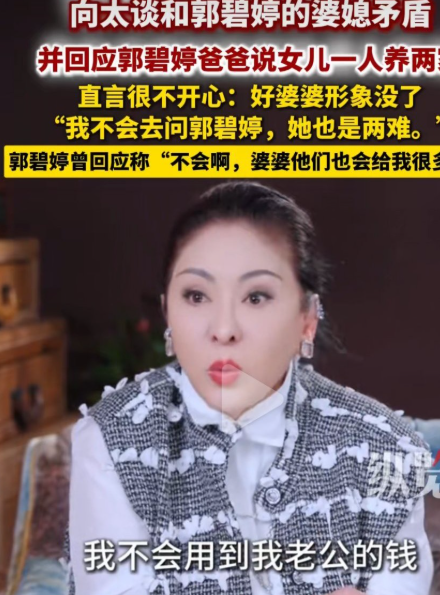 向太回应关于好婆婆形象没了一事。网友听郭碧婷爸爸一句,她一个人赚钱养两个家,好辛苦,向太经营多少年的好婆婆形象瞬间没了,向太也不高兴。但是她不会去问郭碧婷或者是郭爸。