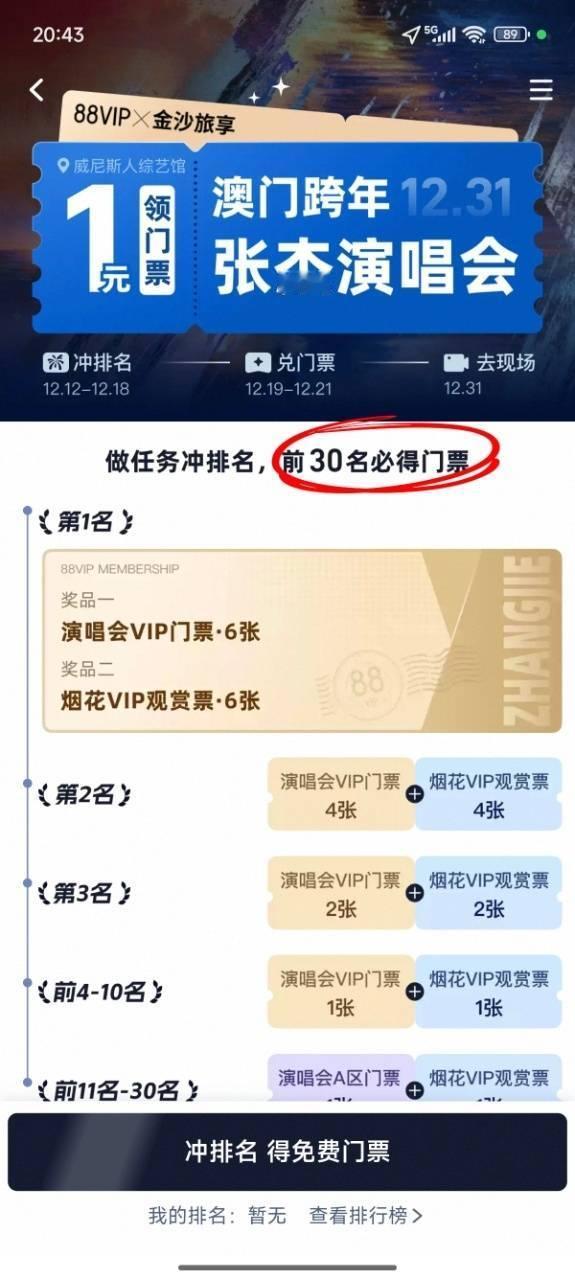 服了,加班错过抢张杰演唱会门票的时间……幸亏同事告诉我,88VIP现在在送张杰演唱会门票!!做任务参与互动就有机会领到张杰跨年门票,而且前30名都有机会诶!!活动到18日才截止,我还有时间!!去澳门看演唱会的时候,用金沙旅享还能领950澳门币,天呐杰哥我来啦!!88VIP 金沙旅享