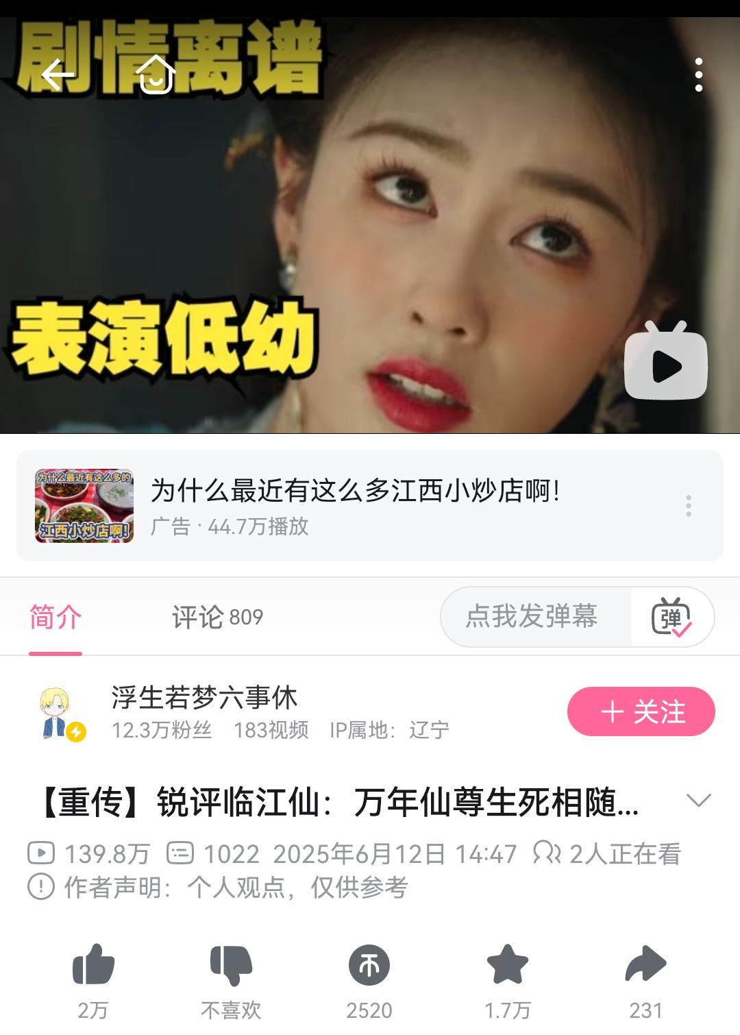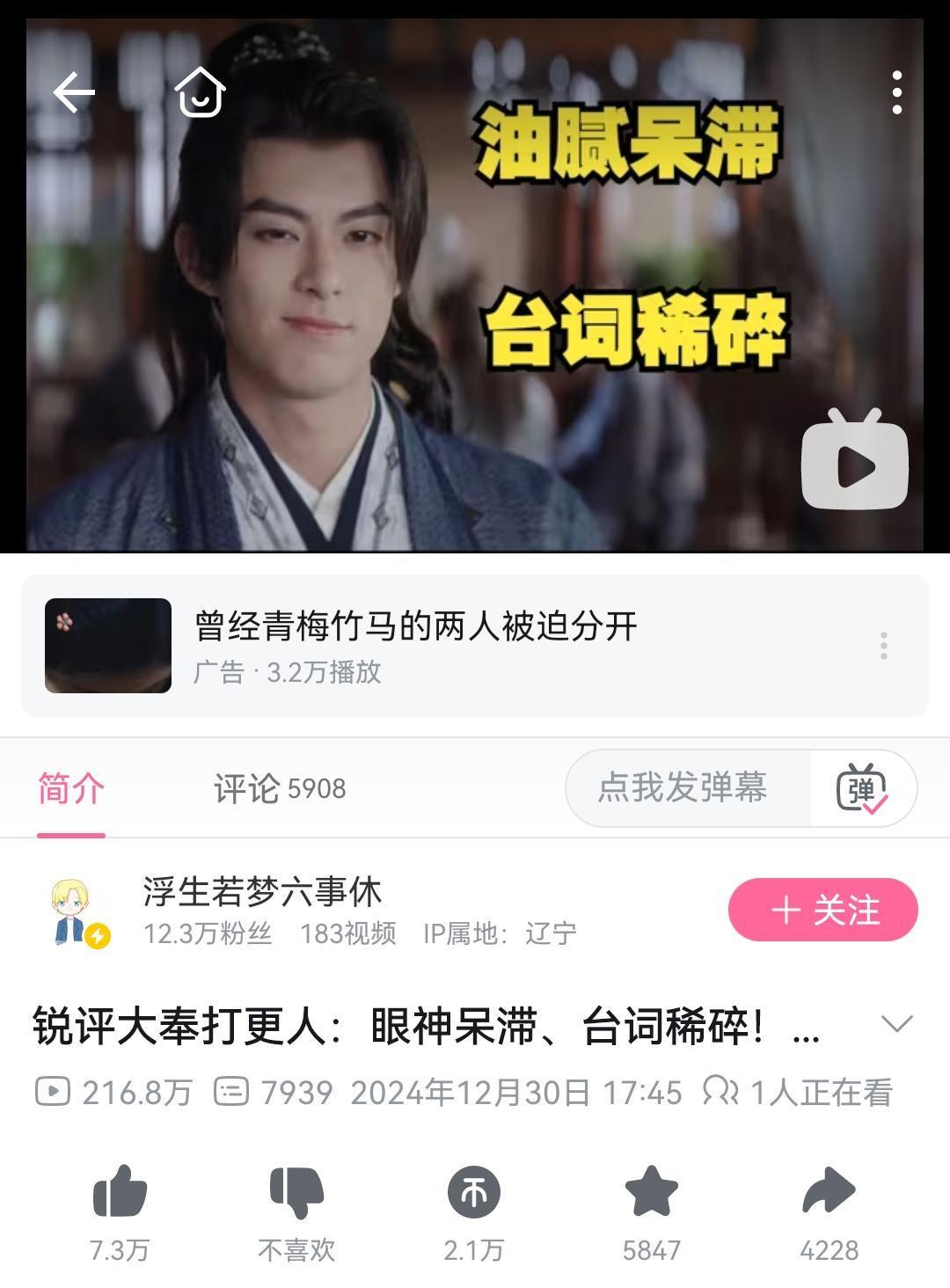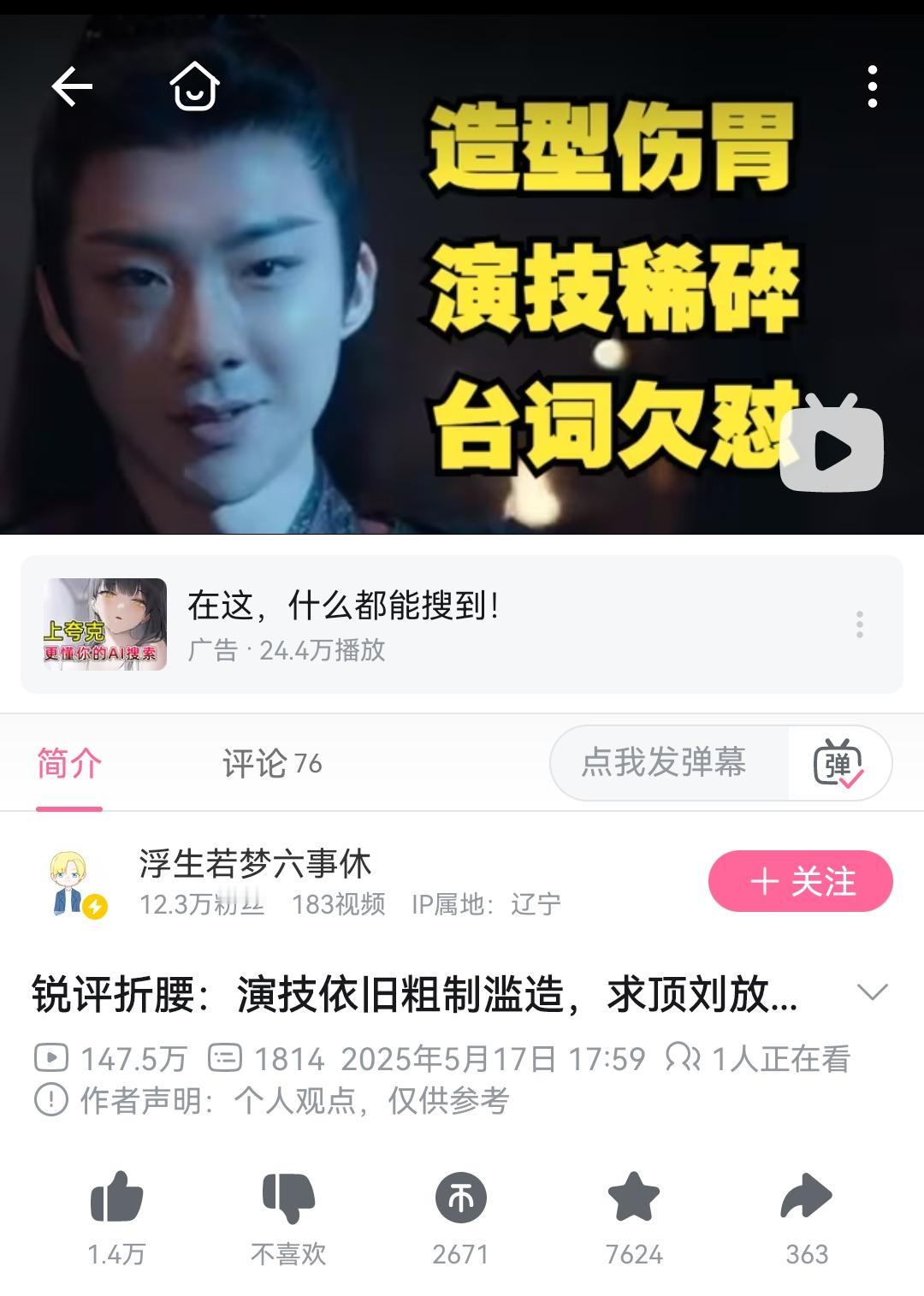 同一个UP主,吐槽视频只有赵露思,白鹿,王鹤棣,刘宇宁被砸钱推流了。正常播放量大概20万左右。 所以,艺人的口碑取决于威胁有多大,剧播的越好,被黑的越惨。 非公平竞争,内娱环境太差了,这四个人再B站,漫天黑水。