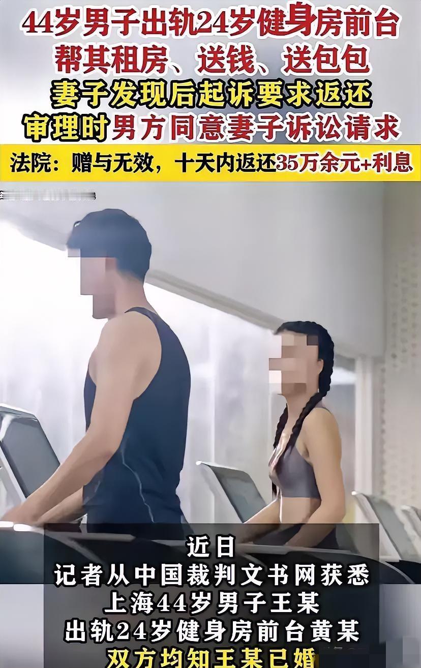 47万全泡汤!已婚男给健身房前台花了16个月,东窗事发后竟和妻子联手上门要钱! 这年头渣男的操作真是越来越刷新三观了!上海一位44岁的男士,和24岁的健身房前台搞到了一起,16个月里前前后后砸了47万,奶茶、红包、奢侈品这些东西一样没少送。结果东窗事发后,他立马变身“妻管严”,不仅把详细的账单都拿了出来,还悄悄录好了对方知情的录音留着当证据! 法院的判决真是解气:钱全得还回来!要知道啊,夫妻共同财产没经过对方同意可不能随便送,更何况这还是违背道德的赠予呢。那女的本来想趁机捞一笔,没想到反而被这个“白嫖男”坑了一把! 更绝的是网友们的评论:“这男的算计玩得也太明白了”“花47万买了16个月青春,到底谁亏了?”在我看来啊,在婚姻里玩火,最后肯定会自食其果,法律可专治这种不服气的。那些想靠婚外情捞好处的,真该好好上这堂天价普法课!这堂课的学费,可真是“贵”到让人长记性啊!你觉得这男的和前台谁更该被骂?
