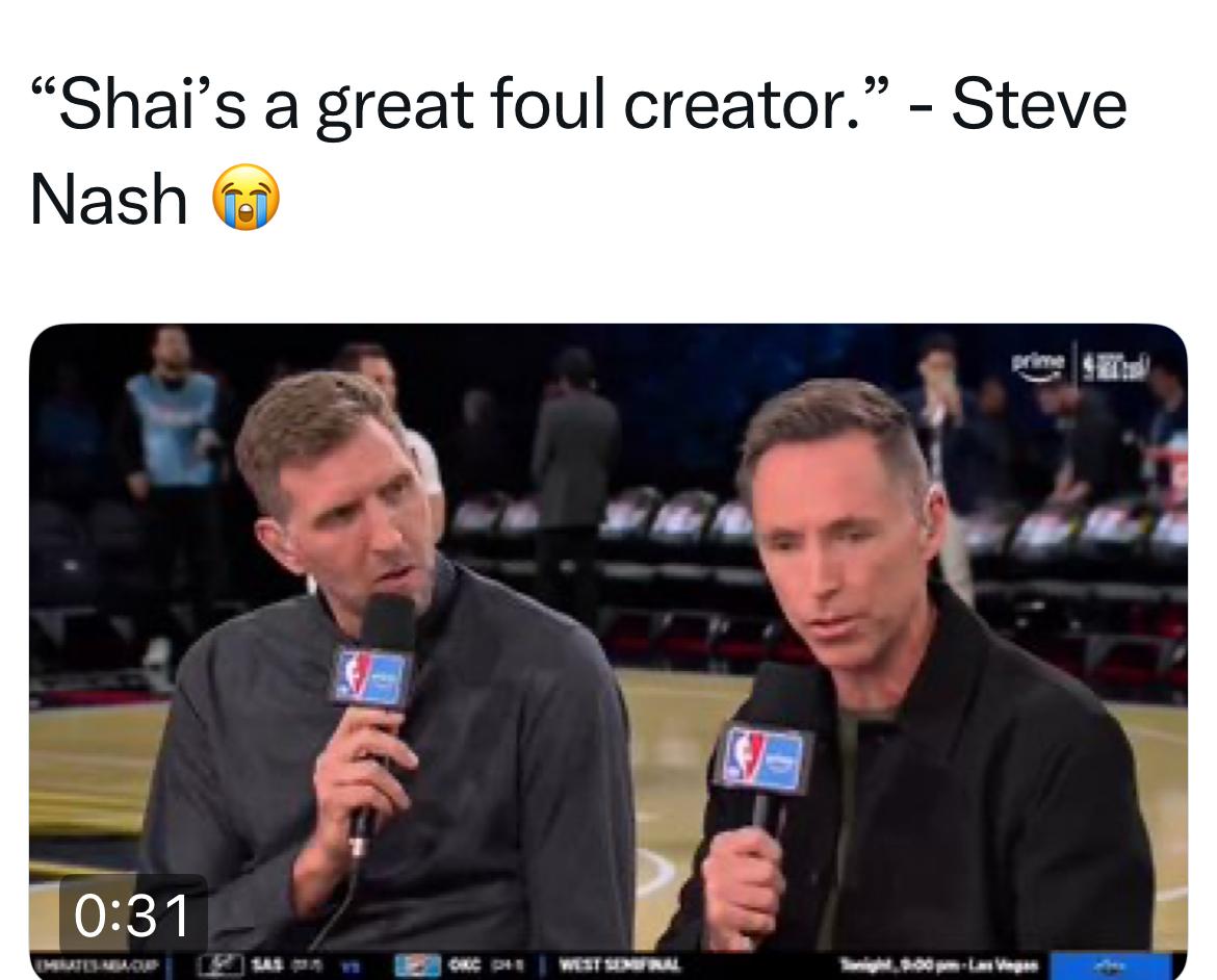 纳什说:“亚历山大是一位很会创造犯规的球员。” 本场比赛中有一个回合,SGA跳投,双脚往前冲落在防守球员的脚上,其实防守球员的圆柱体保持的很稳定,很直,手交代的清楚,也没有伸脚垫别人的意思,但裁判响了哨,并且看录像回放,以确认是否升级为恶意犯规。好在只是一次“普通犯规”,两次罚篮。 今天马刺的多名防守球员都不敢近距离接触亚历山大。 今天的比赛,纳什和诺维茨基现场观战。