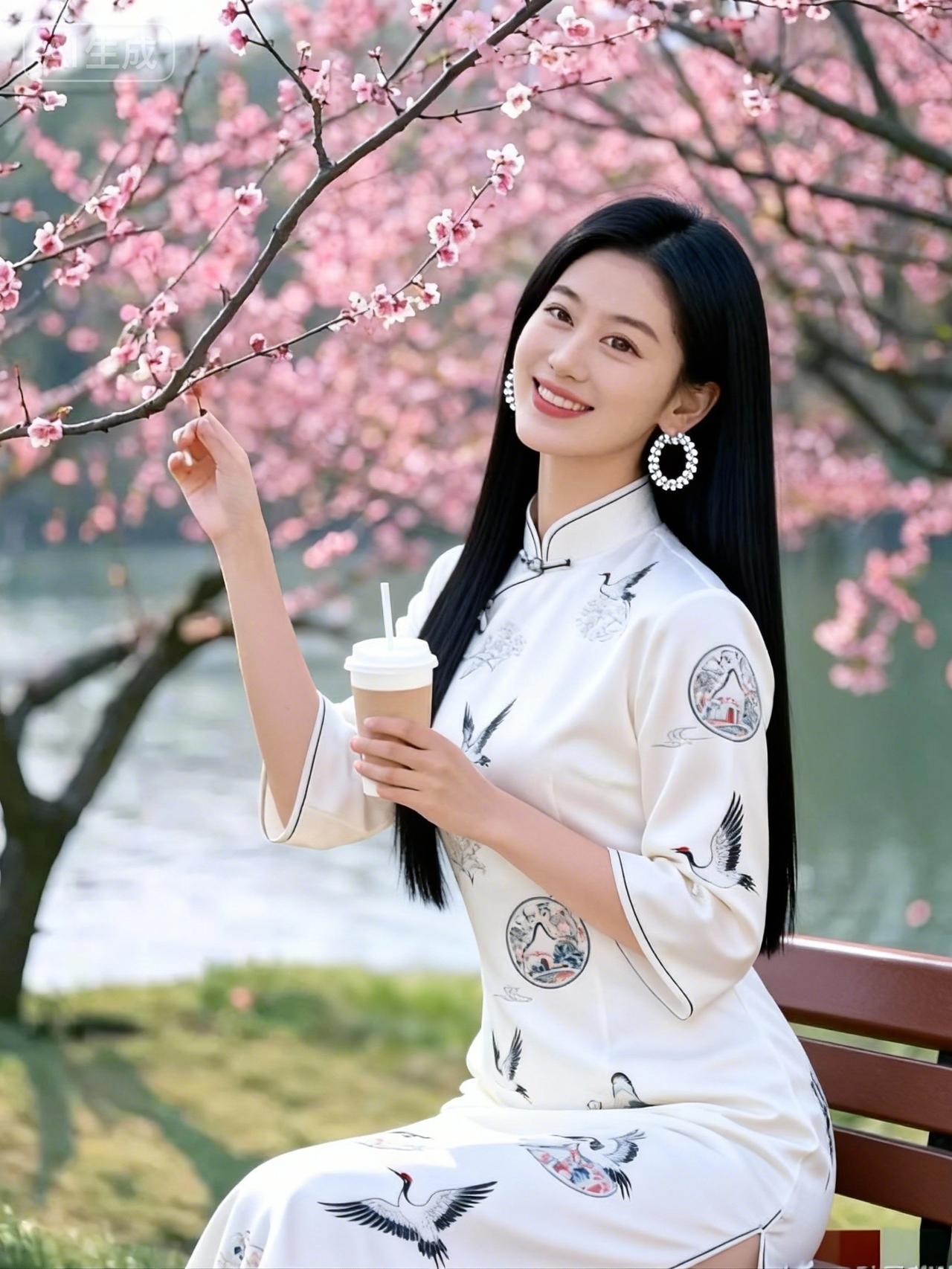 桃花树下,优雅旗袍,手持咖啡,春日时光。