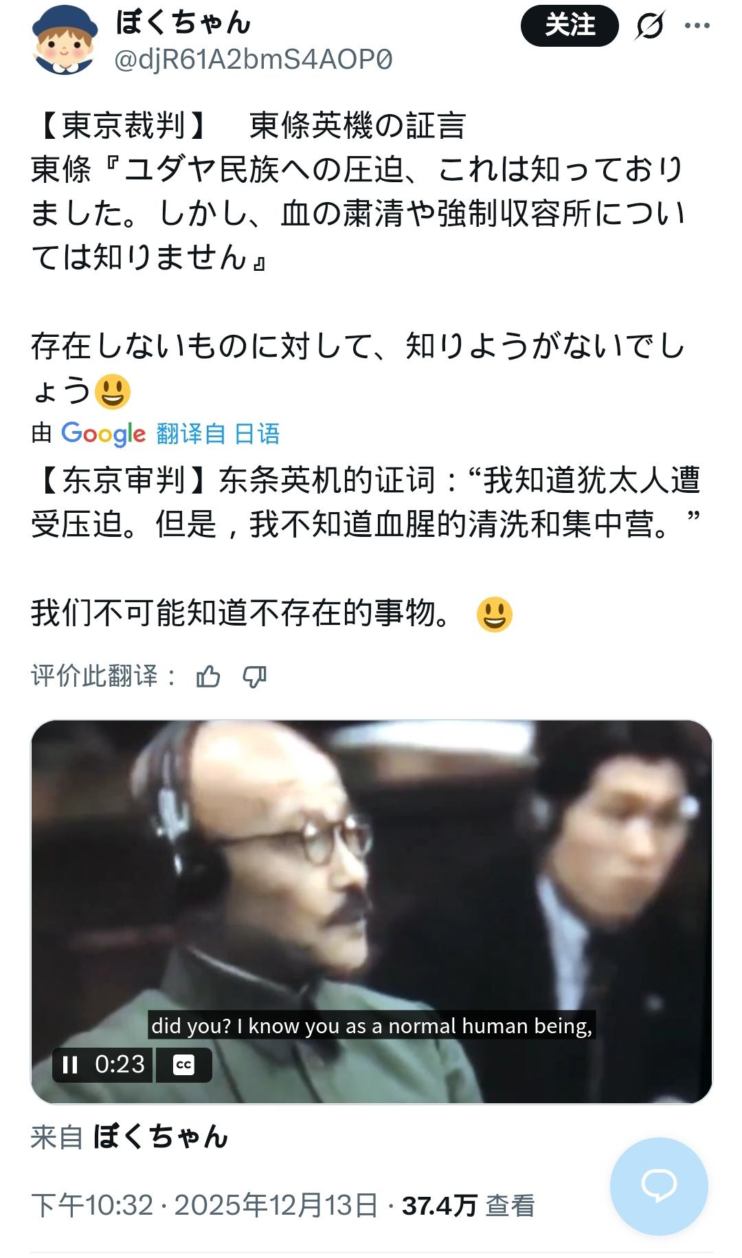 为何高市拒不“认错”?看看东条英机就懂了 最近,最近经常刷到JP极右翼在大量散布远东军事法许对东条英机的审判,但拒不认罪的视频——不太像是偶然的历史重温,更似一种蓄意的现实暗示。 读历史知道,东条英机对全部55项起诉罪名(包括反和平罪、战争罪、反人类罪),全面持“无罪”抗辩。 在日本人的意识里,好像只要坚守“八纮一宇”的“神圣使命”,就能够保持它们“兽性”一贯,这比回归“人性”更重要。 否则无法解释,为何杀人如麻的刽子手,从无一点悔意 人与动物的区别难道不是恻隐之心? 回看历史,战国时期的白起在坑杀数十万赵军后,晚年尚有“我诈而尽坑之,是足以死”的锥心悔恨。这份属于人性的煎熬与反省。可两千多年后的今天,在某些国家,某些人群中,却仍然如此稀缺。 不得不说,得亏高市搞事,让世界上更多人读懂了日本! Source: X