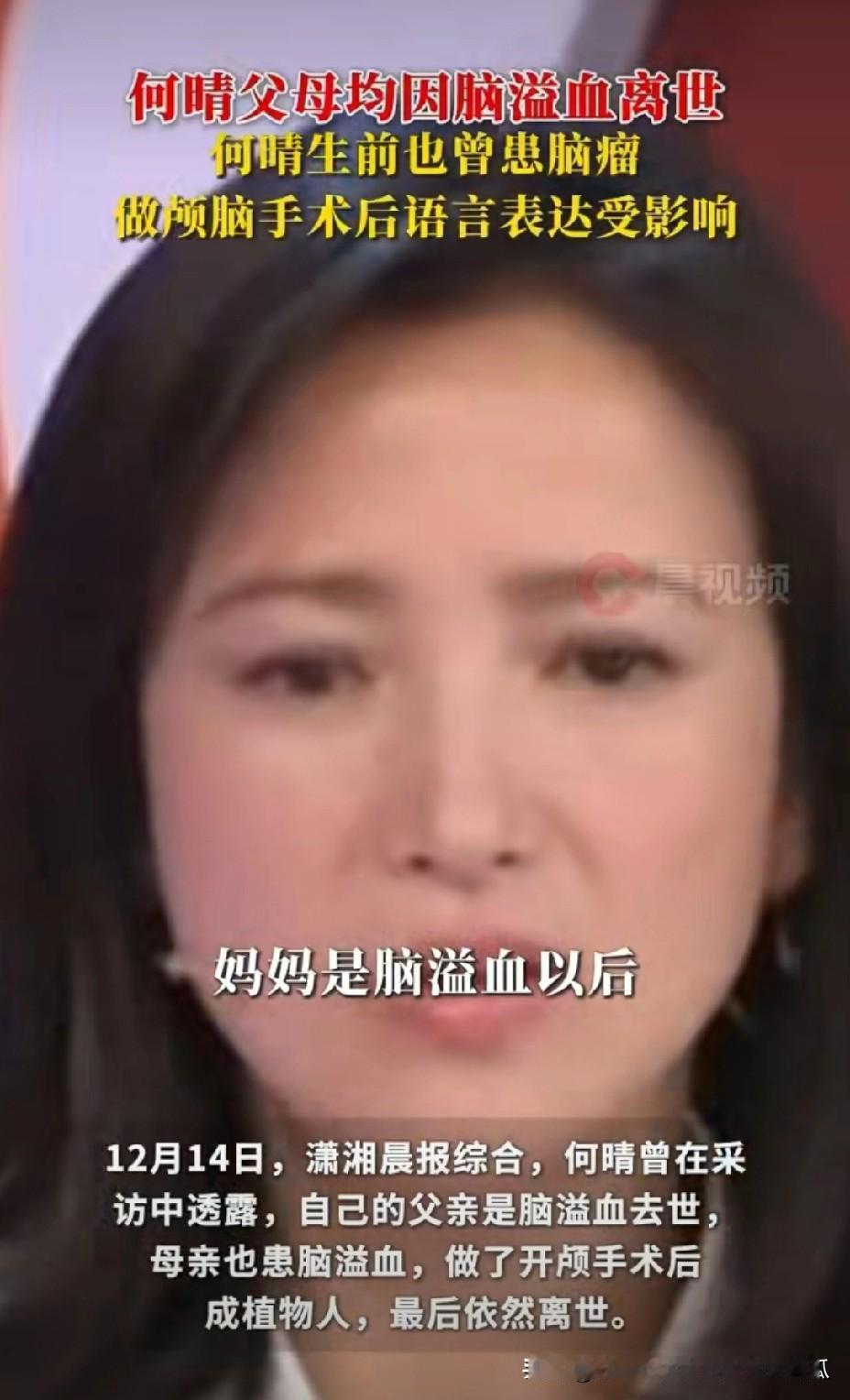 去世的影星何晴曾在采访中透露, 自己的父亲是脑溢血去世, 母亲也曾患脑溢血做过开颅手术, 而何晴2015年确诊脑瘤, 后面也做过颅脑手术。 从这些信息来看是不是何晴的基因本身就在这方面有问题, 父母皆是患过这方面的疾病。 遗传的基因病这个确实没有太好的办法, 至少目前的医学科技很难解决。