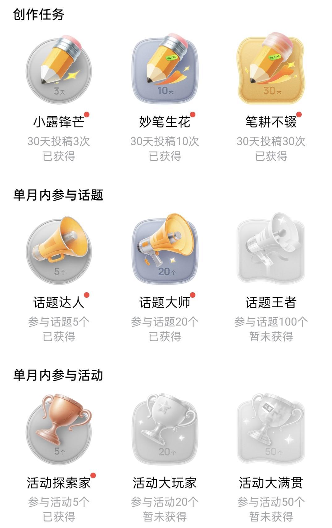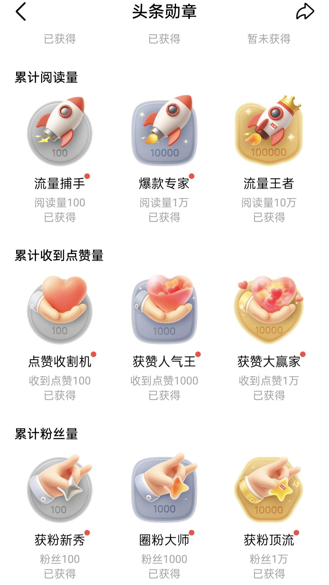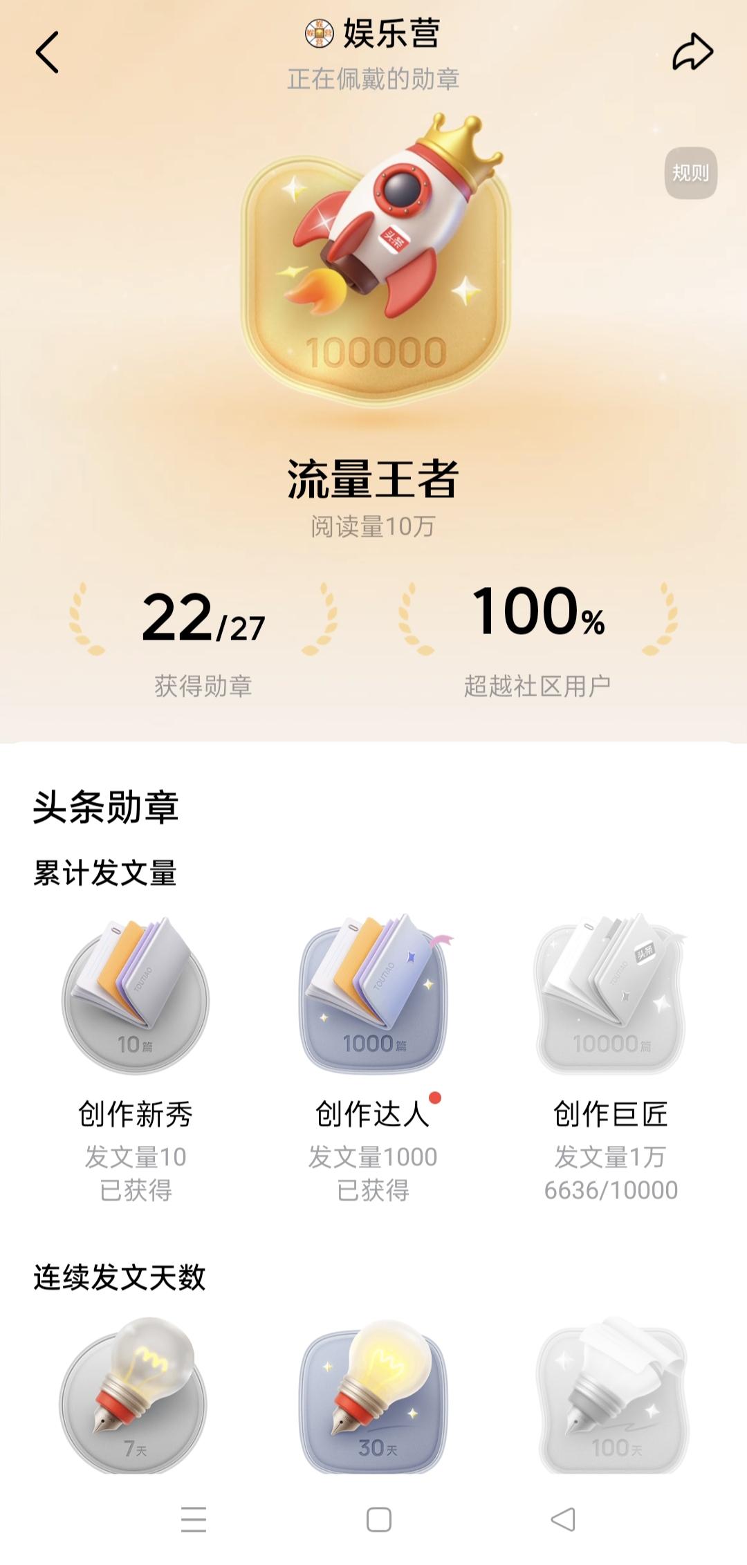 深耕头条9年,获得了勋章22枚。真心劝一下平台能不能不要整这么胡里花哨。 什么“流量王者”,“爆款专家”,“创作达人”,都是一些虚名,没啥实际意义。 就如当年玩QQ秀一样,只能看自己陶醉一下,完全没用。 还不如平台发点实际的什么流量卡或者奖励更实际呢! 相比去年,今年的头条更难做了。去年由于首发补贴的方案,很多友友们一年下来收益十分可观,多的好十几,二十几个W。 小女子不才,由于平日里要带娃,去年大概在6个W。 但今年马上要结束了,5个W还没到呢!实在有些心塞。 不过,整个大环境不好,自媒体领域也是越来越难。 以往,除了写作,视频等收益之外,广告派发也挺多。 曾几何时,接下某一个综艺节目,一个星期发2-3篇,每篇200,整个节目下来,能够获得大几千呢! 可近年来,广告难接,对于自媒体创作者们来说少了一个重要收入。 隐约觉得头条创作者越来越多了,而流量还是这些流量,想要从中分得一杯羹可谓是难上加难。 不过,还是那句话,做自媒体靠的是耐心和坚持。2025即将结束,愿友友们明年继续发发发。