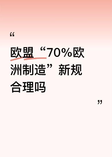 欧盟“70%欧洲制造”新规合理吗欧盟在新能源汽车方面无法改变中国独大的局面,不是欧盟没人才而是欧盟执政者战略格局和眼光,说白了没有远见,就是新瓶装旧酒。欧盟内部缺乏的是能带领欧盟走出美国给画的怪圈有魄力有胆识的领导人。长久以来欧盟是生活在美国这颗大树下,美国为其挡风遮雨,如今这颗大树自身已经无法全身心支撑自己生存空间,奈何只好修枝剪叶,这让习惯了呗被呵护的欧盟无所适从。其实对于欧盟来说既是危机也是契机,只要欧盟能够当下成见,与东大寻求多方面合作,与俄罗斯签署互不侵犯条约,那么欧盟自身安全能保障的同时,可能把大量资金投入到科技研发人才培养方面来,相信不久的欧盟一定能够实现“欧洲制造70%”的宏伟目标。