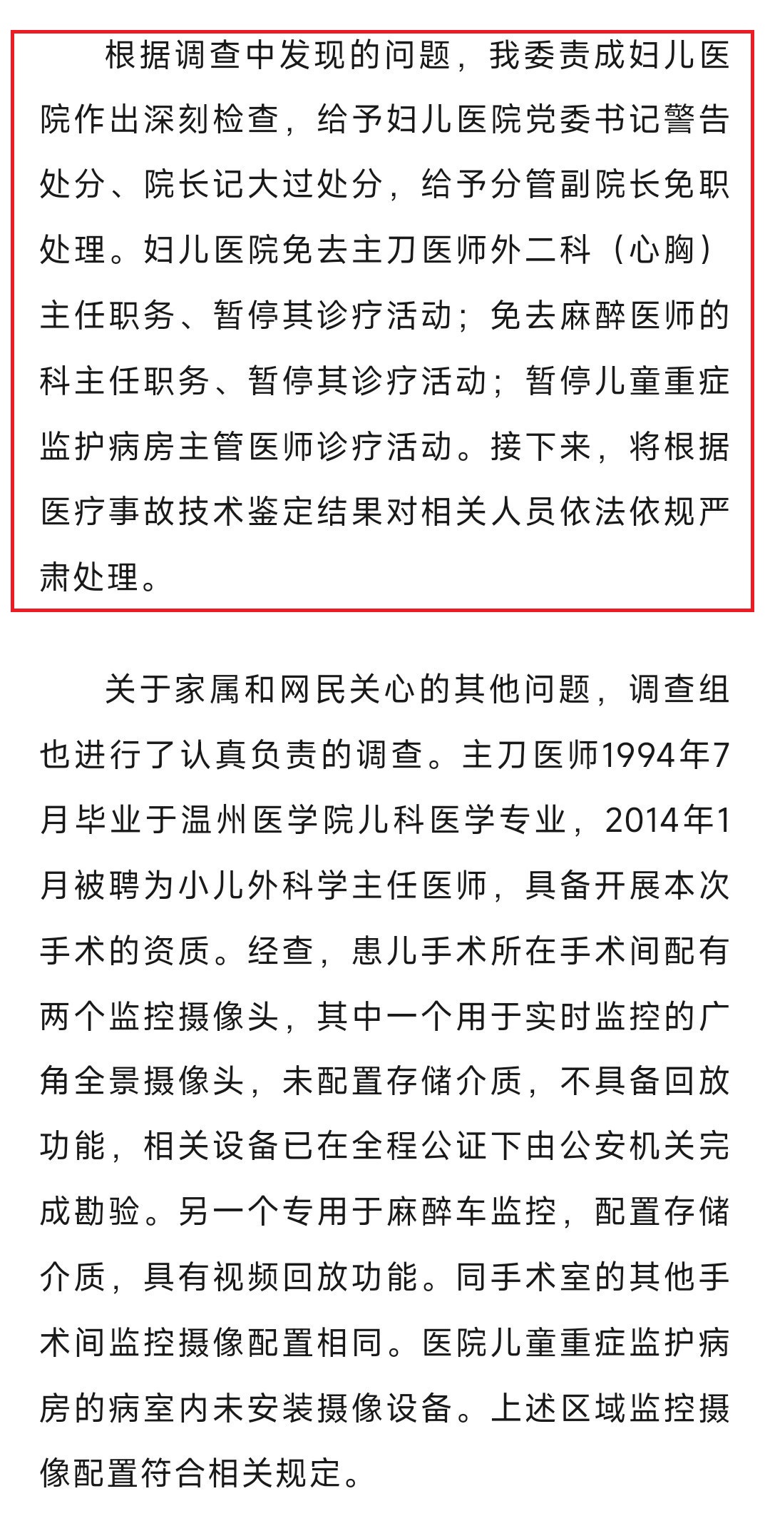 1、医疗团队对手术风险评估不足、手术操作存在过失、术中出现突发情况未及时告知、术后监护处置有缺陷等问题。 2、医院存在医疗质量安全制度落实不到位、风险防范能力不足、应急处置不力、人文关怀缺乏等问题。 3、给予妇儿医院党委书记警告处分、院长记大过处分,给予分管副院长免职处理。妇儿医院免去主刀医师外二科(心胸)主任职务、暂停其诊疗活动;免去麻醉医师的科主任职务、暂停其诊疗活动;暂停儿童重症监护病房主管医师诊疗活动。 4、最终结果将根据医疗事故技术鉴定结果对相关人员依法依规严肃处理。