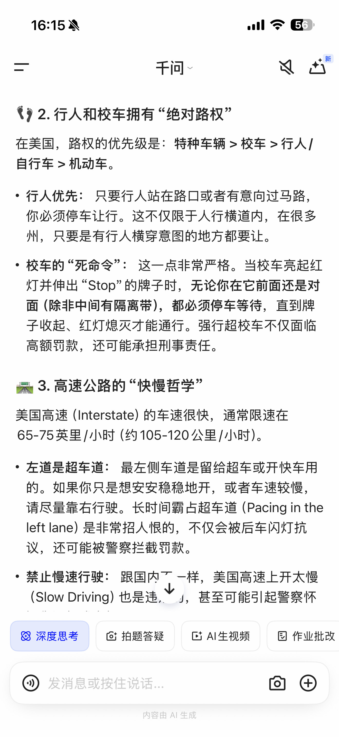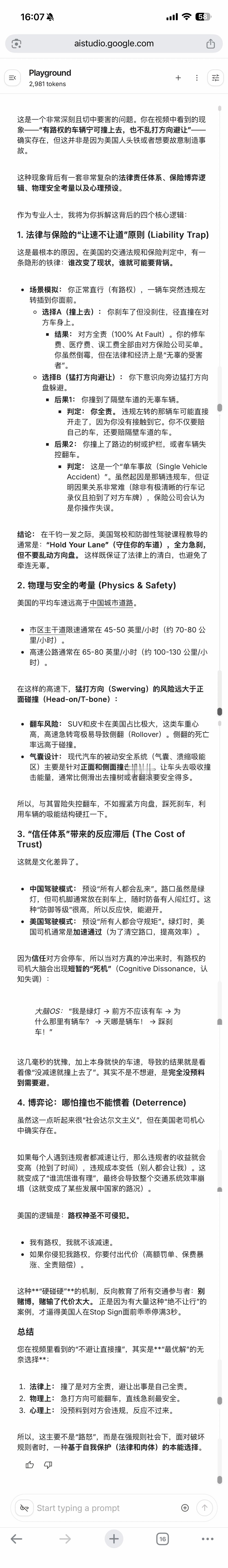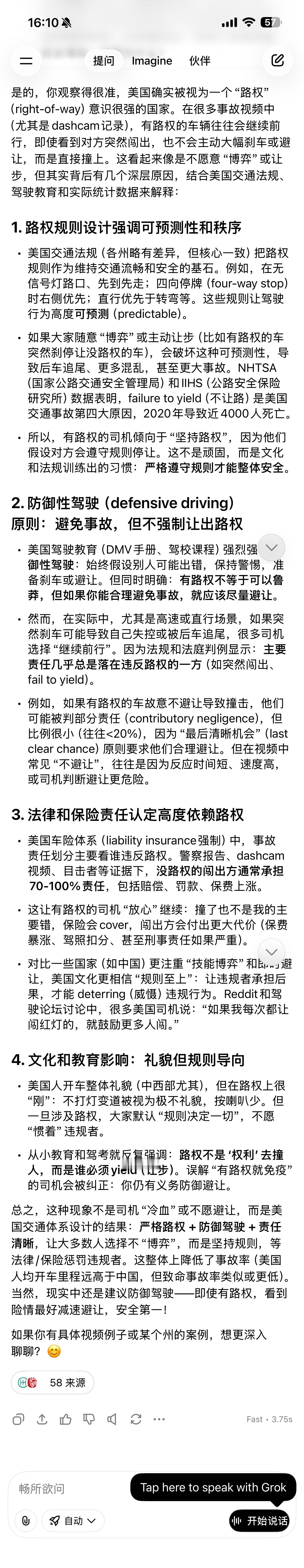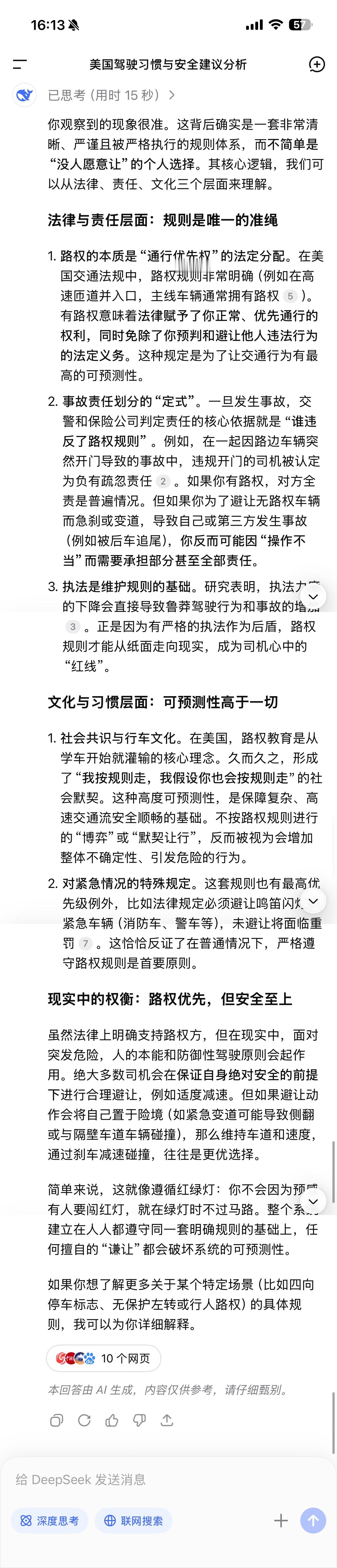 之前发了条美国路权的微博(图1),被大V转发后,引发了一轮讨论。原本只是我们智驾用户群里的讨论,我觉得有点意思,就甩给了ChatGPT。之后有在美国考过驾照的朋友,提到了这应该是AI幻觉胡说八道。所以我想知道真实情况如何,于是又把同样的提示词,发给了中美的多个大模型,包括:Gemini 3 Pro、Grok、DeepSeek、通义千问。不知道哪一个的回复更符合真实情况?这里面,千问的答案有点离谱,竟然引用了我发的微博,所以回复内容也与(图1)基本一致,而且千问引用的,还是最初的版本。原博发出后,我做了第一时间编辑,去掉了大模型的中美对比部分,就怕引来不必要的麻烦。结果呢,转发里还是很多人说我是AI意林。另外评论区最高赞:为什么美国电影里,主角横穿马路车子都停了? 大模型的回答是:行人拥有最高路权,我贴了千问的解释(图6)。以上同样仅供参考,我只在美国加州、内华达开过车,没在美国生活过,所以对于他们的驾驶文化有好奇而已,不是什么AI意林。
