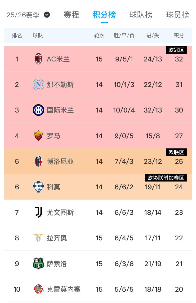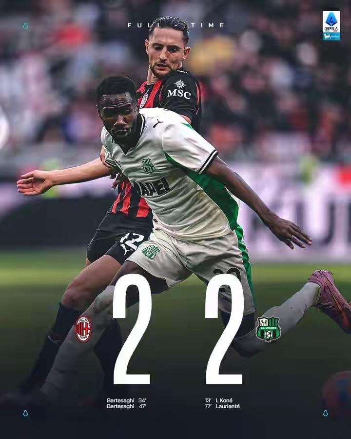 又一次翻车了!意甲第15轮排名榜首的AC米兰主场被升班马萨索诺2:2逼平,痛失2分,且终结了自身的三连胜。目前AC米兰多赛一场领先那不勒斯1分,领先国际米兰2分。 国际米兰本轮只要客场拿下热那亚将在积分榜上反超AC米兰。如果那不勒斯客场对阵乌迪内斯也丢分,则国际米兰有望登顶积分榜。 加油,国际米兰!加油,乌迪内斯!
