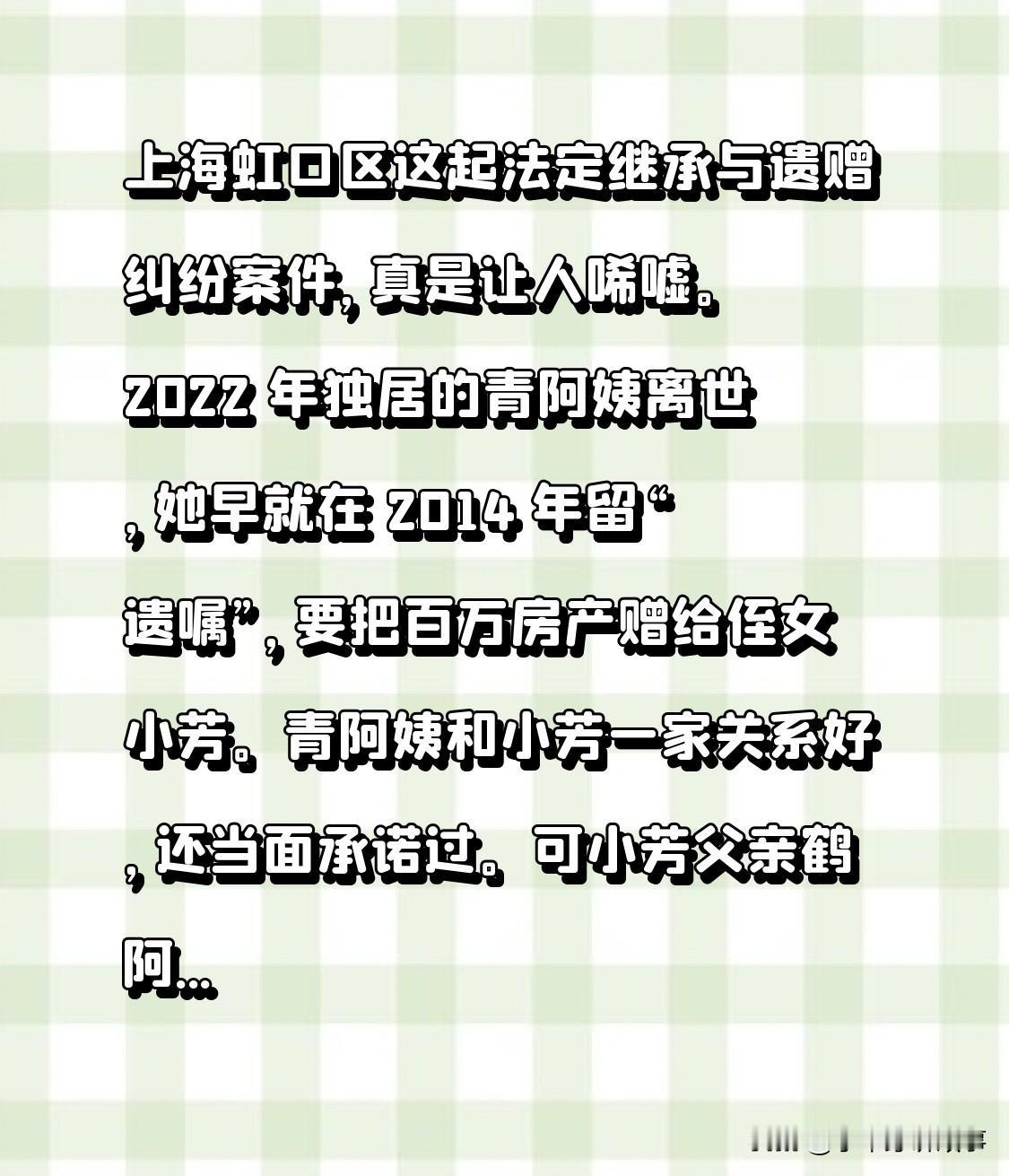 惊!上海虹口区这起法定继承与遗赠纠纷案件,令人唏嘘不已。2022 年,独居的青阿姨离世。2014 年她就立下“遗嘱”,要把百万房产赠予侄女小芳,还当面承诺过。 但小芳父亲鹤阿伯为避纠纷,隐瞒死讯和“遗嘱”。一年后大哥召集分遗产,他仍未透露。小芳知情后急忙主张权利,松大伯等三人却不回应还起诉。 “遗嘱”虽有效,但受遗赠要在知情 60 天内表示接受,小芳大概率因父亲隐瞒错失房产。这亲情与财产的纠葛,着实闹心。