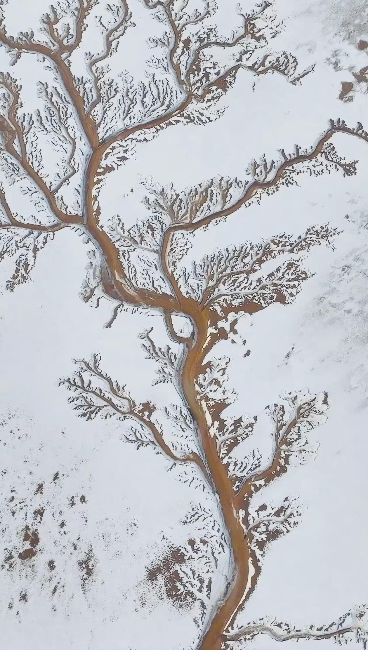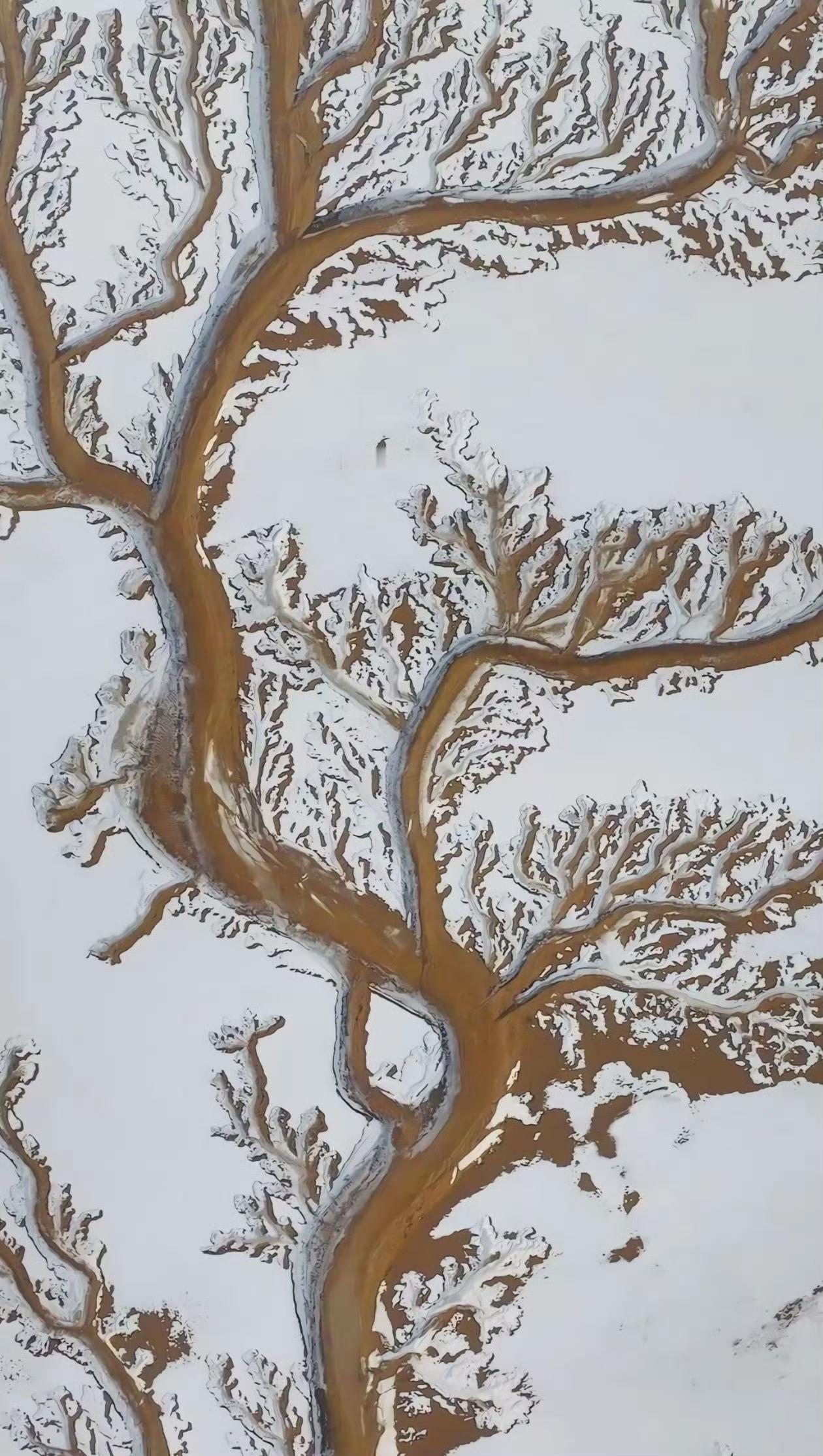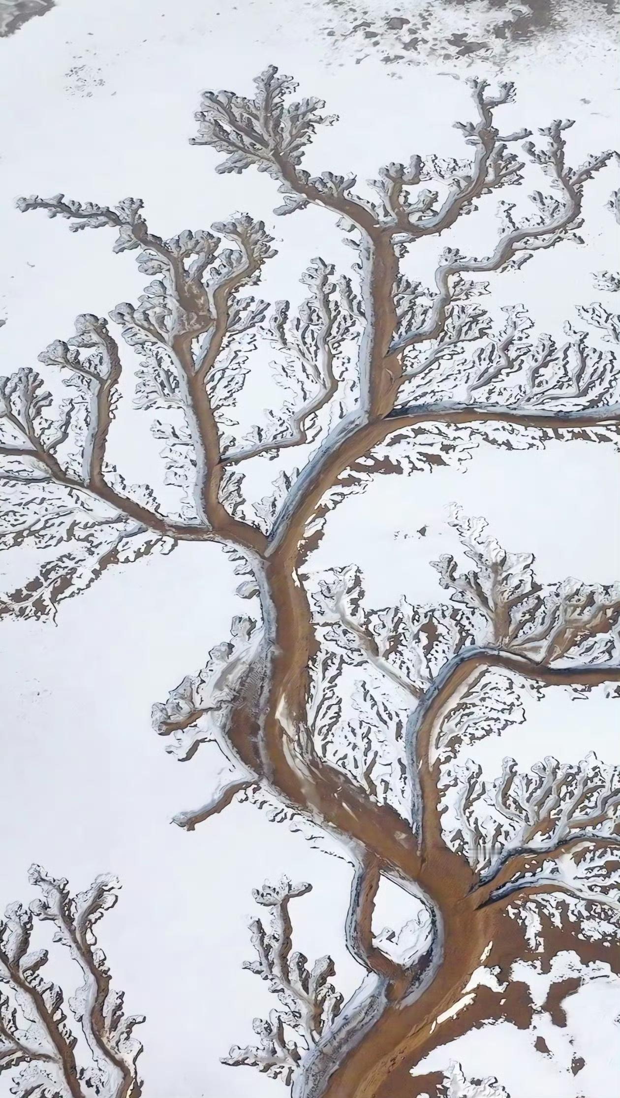 太美了!大雪过后,空中俯瞰黄河入海口的潮汐树。