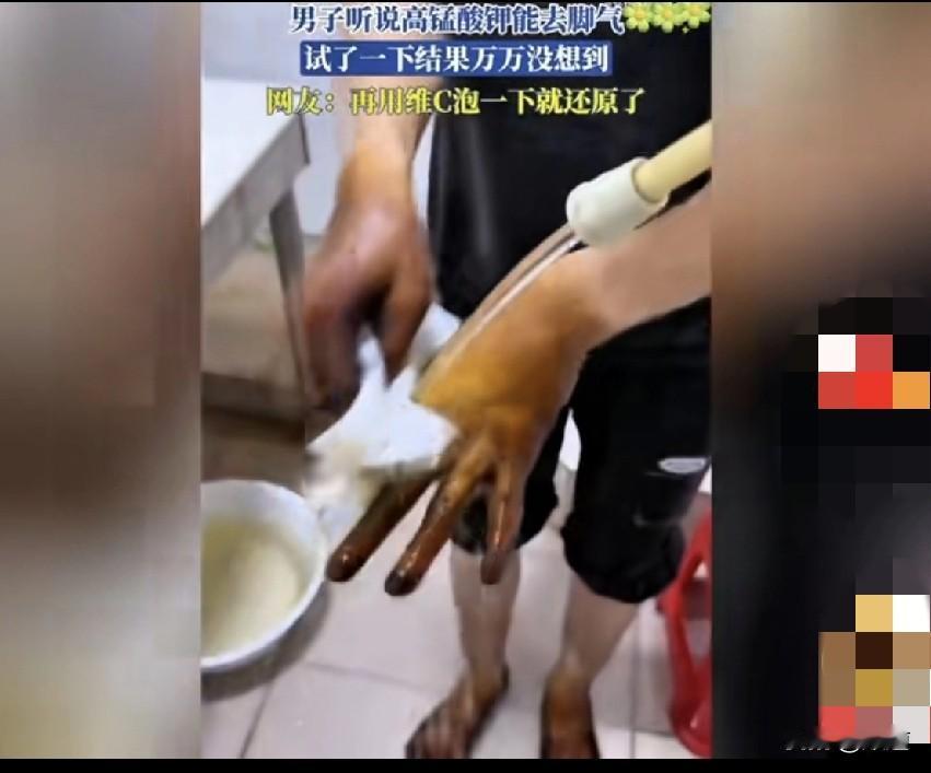 网上欢乐多, 一男子患了脚气,挺严重。听说用高锰酸钾水泡脚就能好,男子迫不及待的就弄来泡上了,而且还下手了。 等他泡完脚,他傻眼了,手脚全染成红色了。 而且怎么洗都洗不掉那种。 不知他在屏幕里心态当时怎么样,,反正我在屏幕外兴奋劲儿已经上来了,笑得我差点儿没从凳子上张过去。 哈哈,我已经开心了。 其实开心很简单,只需一个搞笑视频。