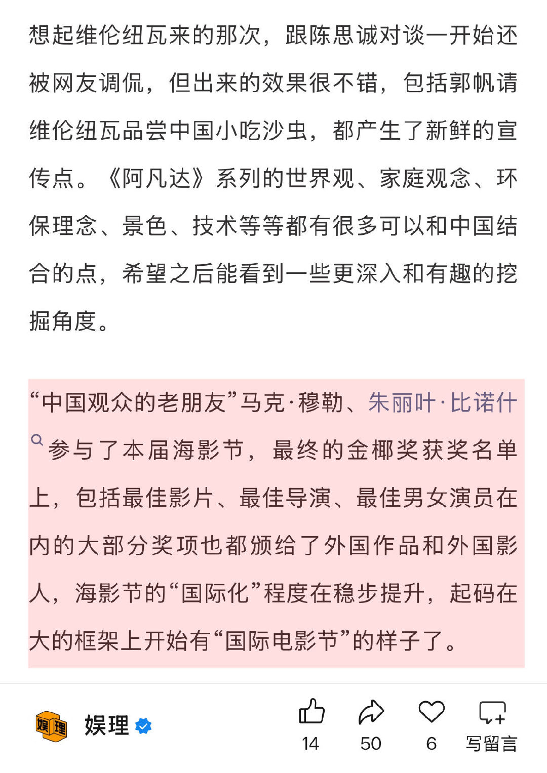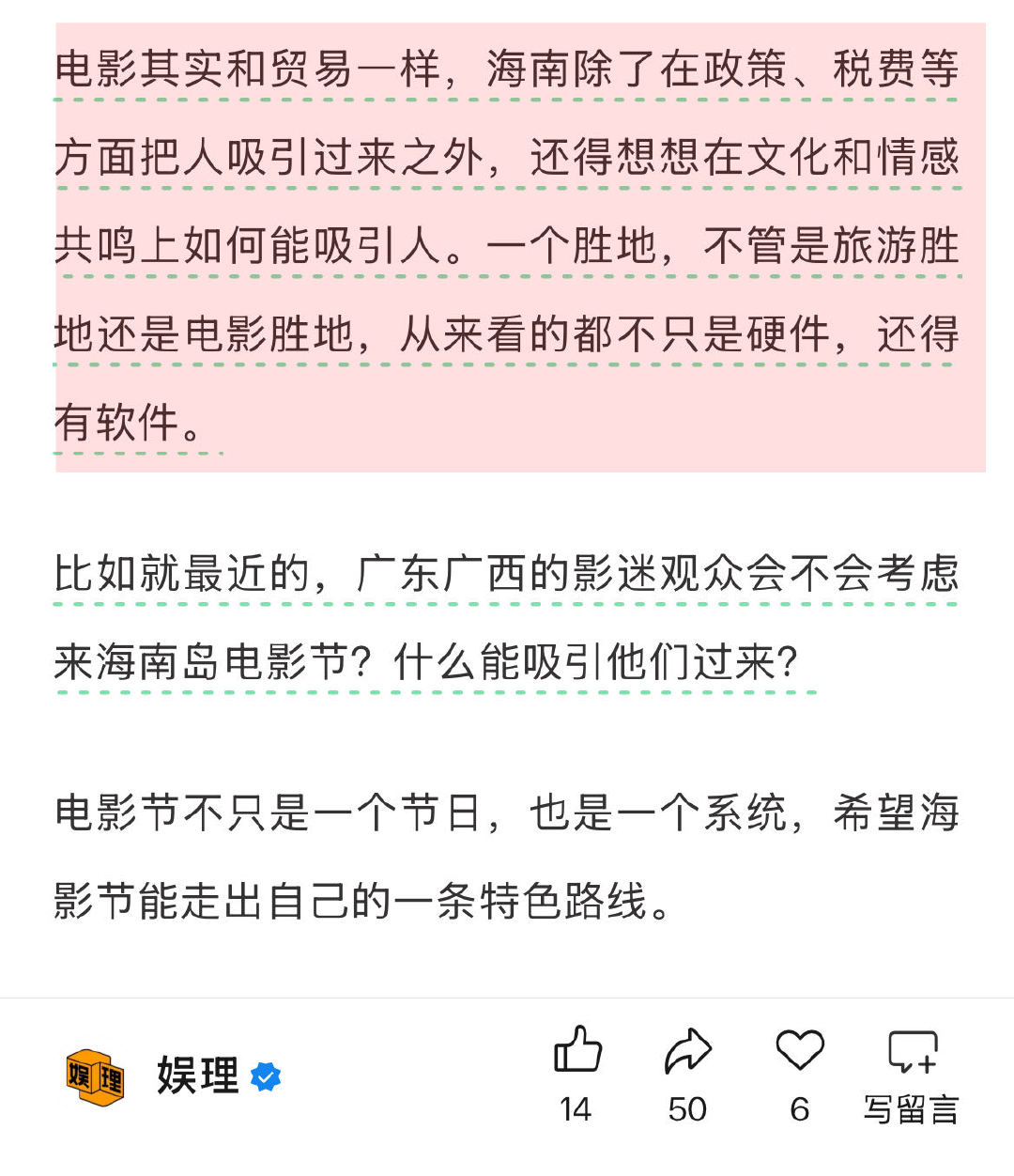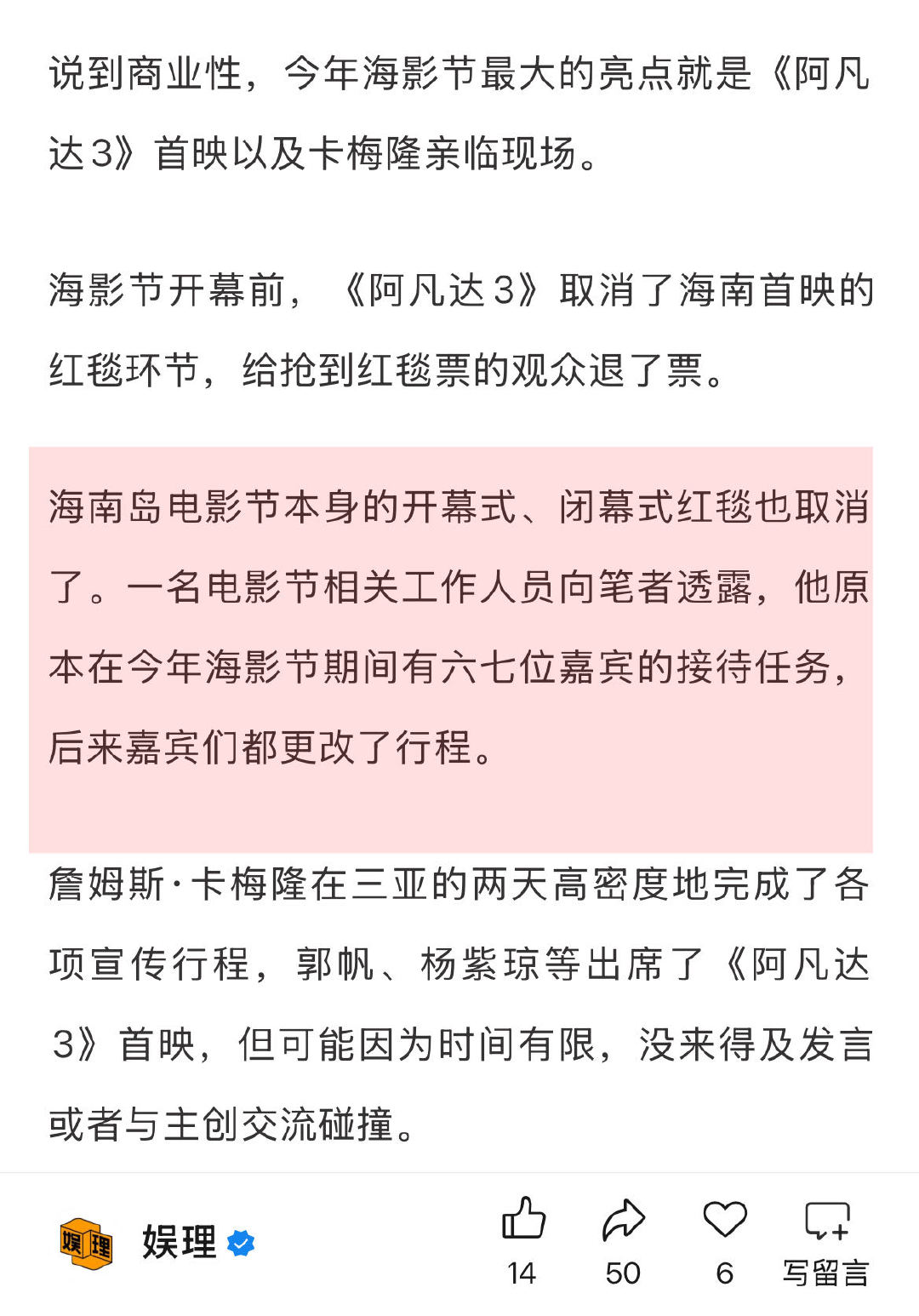 海南岛电影节正在步入正轨 今年的海南岛电影节有哪些变化 今年海影节最大的亮点就是《阿凡达3》首映以及卡梅隆亲临现场。电影节开幕前,《阿凡达3》取消了海南首映的红毯环节。电影节本身的开幕式、闭幕式红毯也取消了。一名电影节相关工作人员向透露,他原本在今年海影节期间有六七位嘉宾的接待任务,后来嘉宾们都更改了行程。娱理独家↓