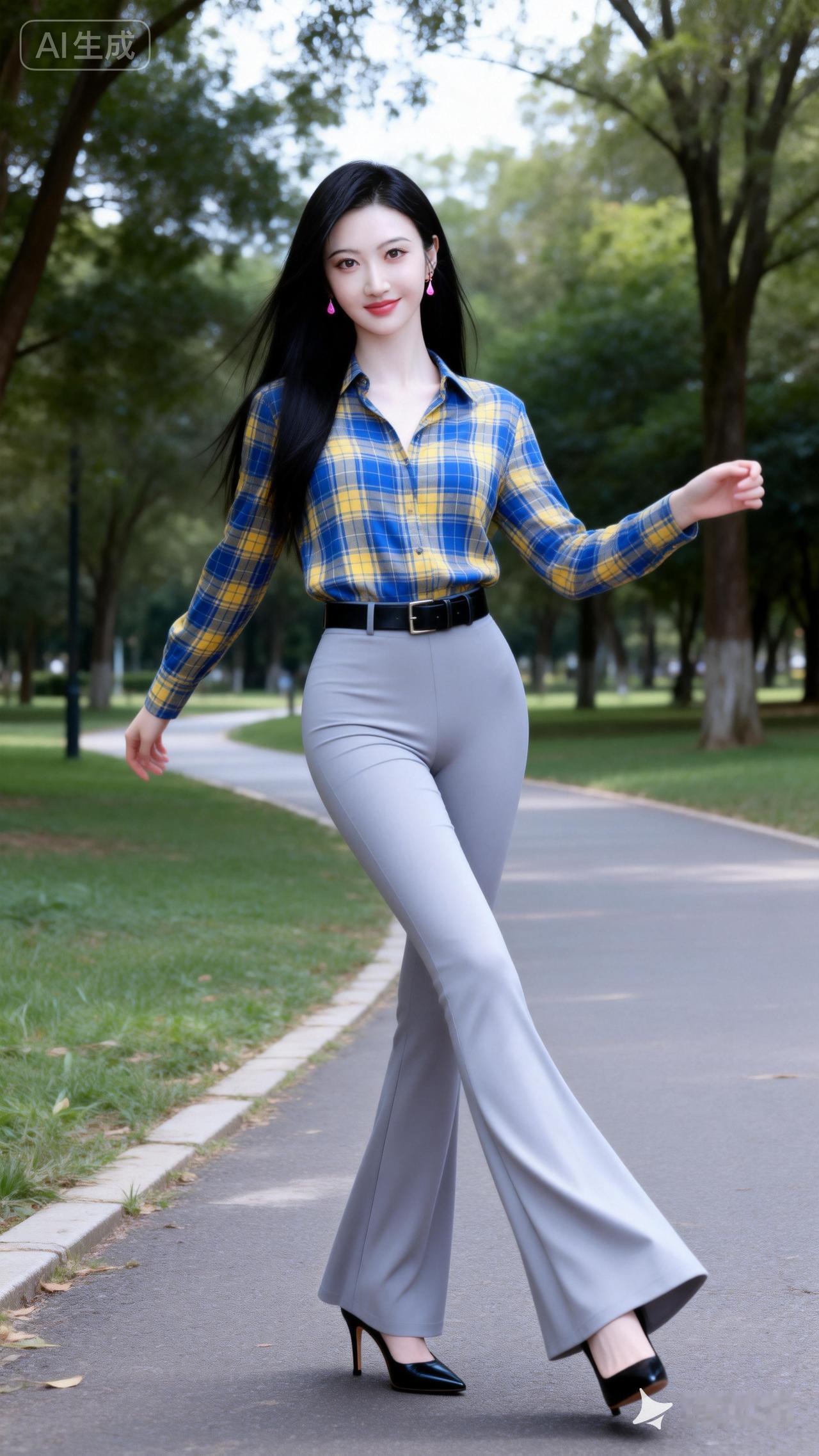 秋日穿搭指南:蓝黄格子衬衫+灰色喇叭裤,优雅气质满满!