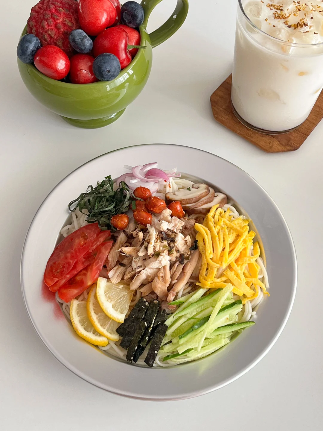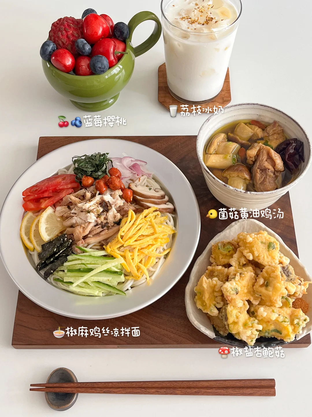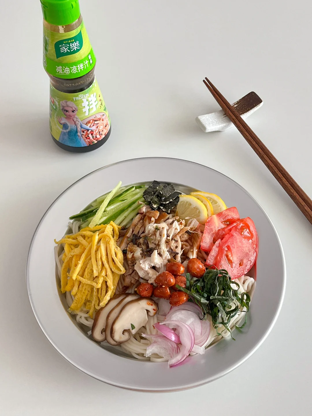 今天的饭: 椒麻鸡丝凉拌面🍜 菌菇黄油鸡汤🐤 荔枝冰奶🥛 椒盐杏鲍菇🍄 蓝莓🫐樱桃🍒 天气热的不想开火 就做个凉拌面778 冰箱里的黄瓜、洋葱、小番茄 随便切一切 鸡肉晾凉了 撕成细丝 夏天吃面我都投一次冷水 更Q有嚼劲 浇上家乐椒麻凉拌汁 瞬间胃口大开 它真的很适合夏天不开火料理 我就喜欢用它 简单一瓶 无需调配 有小米椒、羊角椒带来的微微辣 也有藤椒、青花椒、红花椒的椒麻 还是减油的配方 夏天吃也是清清爽爽的 管理期可以用它做椒麻牛肉、鸡丝凉拌菜 水煮菜直接淋上凉拌汁 微麻微辣 放心吃~