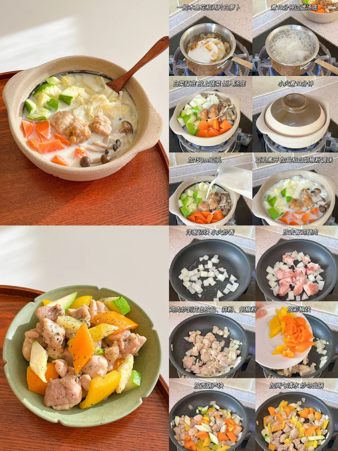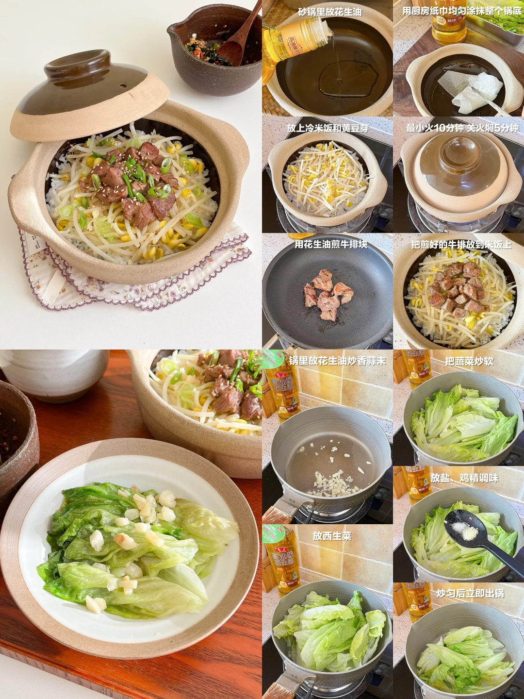 “小小的砂锅最适合一个人吃饭啦!” 整理了最近很喜欢的小锅料理 都是简单好做的 减脂期用小锅也比较好控制饭量 教程都在图片里 🟡牛肉豆芽饭+蒜蓉生菜+生蚝蒸蛋 🟠豆乳丸子蔬菜锅+彩椒鸡肉+南瓜米饭 🔴白菜豆腐豆乳黑鱼锅+卷心菜炒豆皮+黑豆米饭 🟢肥牛砂锅饭+彩椒玉米笋+泡菜