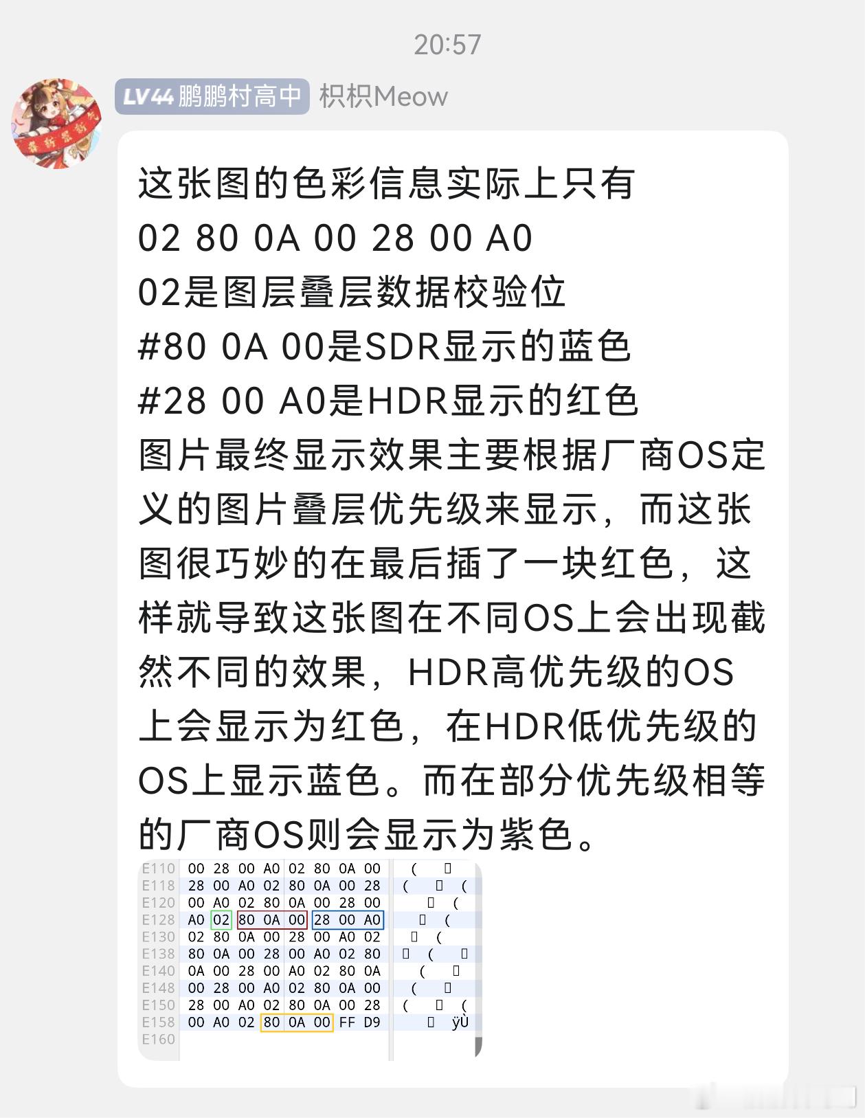 好神奇!大家试试这是什么原理?保存图2到相册,打开看的颜色不一样。只有华为鸿蒙的手机,才能看到正常的HDR红色。我用Mate80看也是红色!(图4是有小伙伴的解释,如果你的手机和系统是HDR优先级高的,且支持HDR显示,那么就是红色)可靠的Mate 鸿蒙越用越香 华为 华为mate80