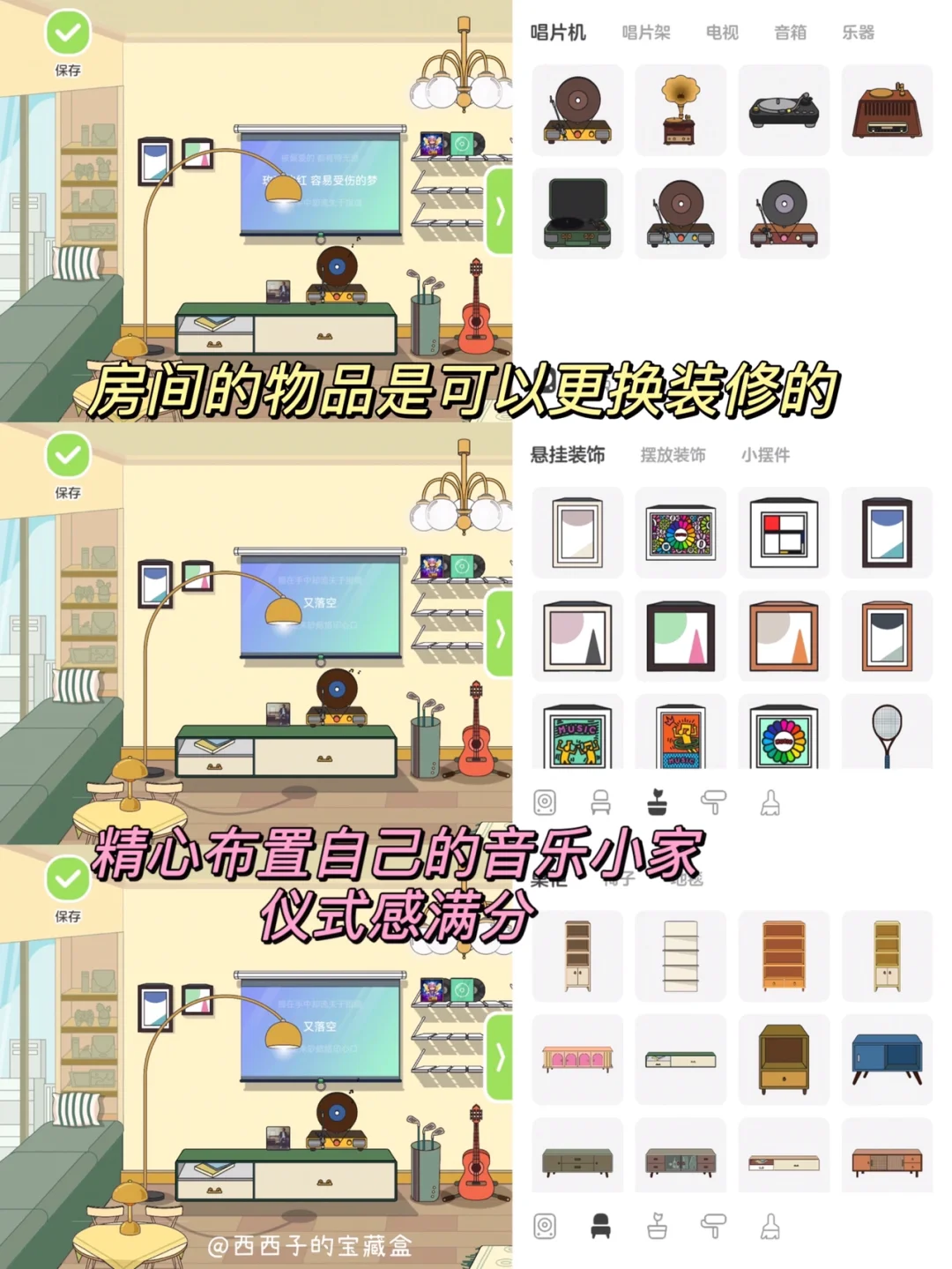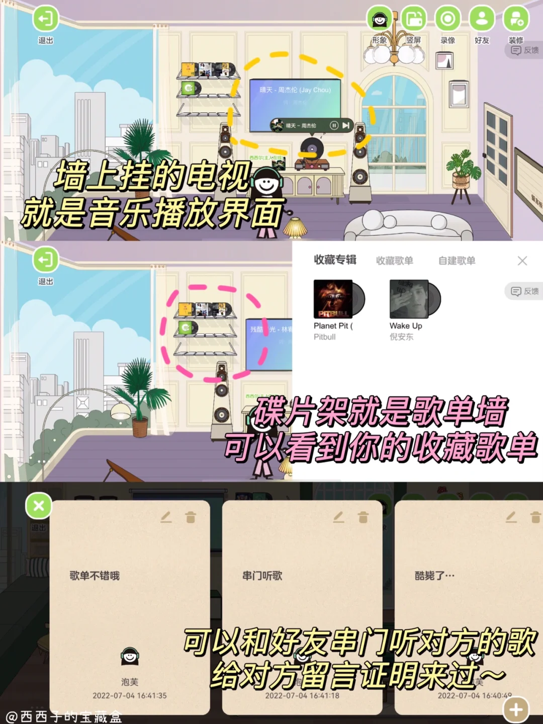 📺小家墙壁挂的电视有虚拟音乐播放界面和歌单墙,点它们是可以进行音乐播放的噢,👬每一个来拜访的朋友都可以听到你小家里放置的音乐~