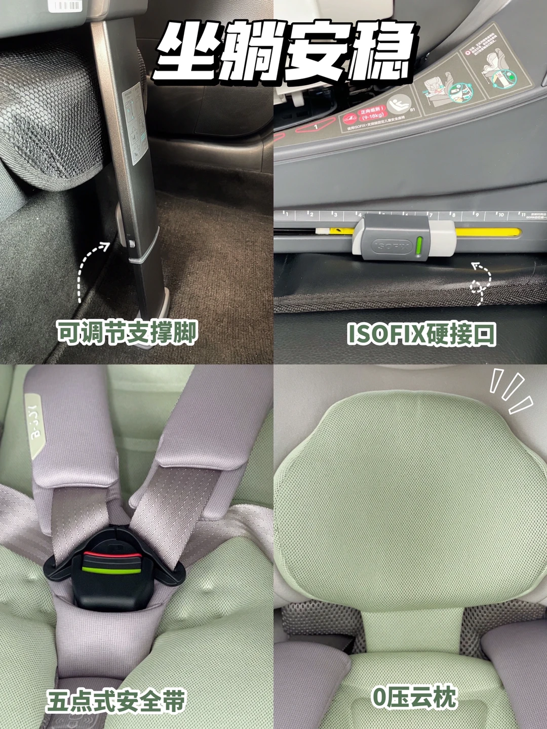 ②要稳固性好:如ISOFIX+抗翻转板+支撑腿,三角稳固就很好,晃动感小