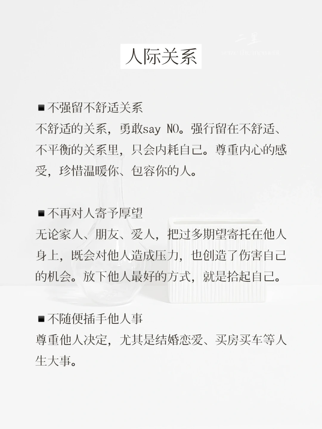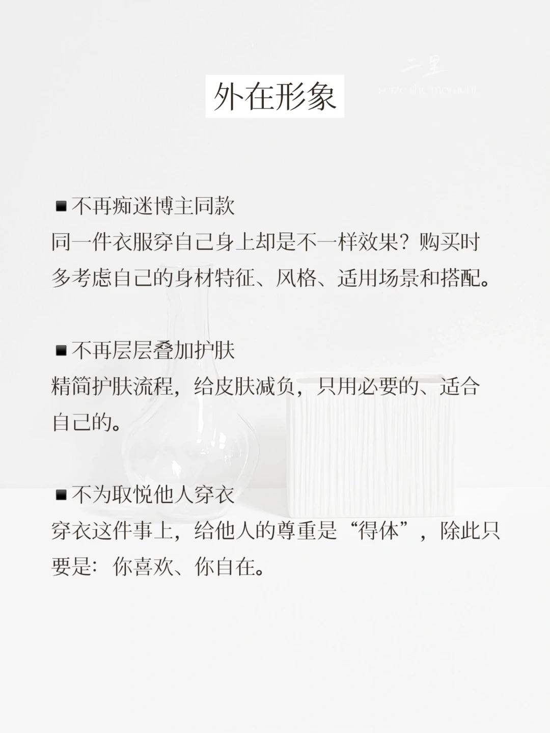 细数这半年改变,不再做的12件事 ▪️生活习惯 1.不闲刷、发朋友圈 2.不再约会必点奶茶 3.不购买家居装饰物 4.闲暇不刷购物软件 ▪️外在形象 5.不再痴迷博主同款 6.不再层层叠加护肤 7.不为取悦他人穿衣 ▪️人际关系 8.不留恋不舒适关系 9.不再对人寄予厚望 10.不随便插手他人事 ▪️自我提升 11.不再追求完美主义 12.不再陷入自证怪圈 简单生活,所得即所需。