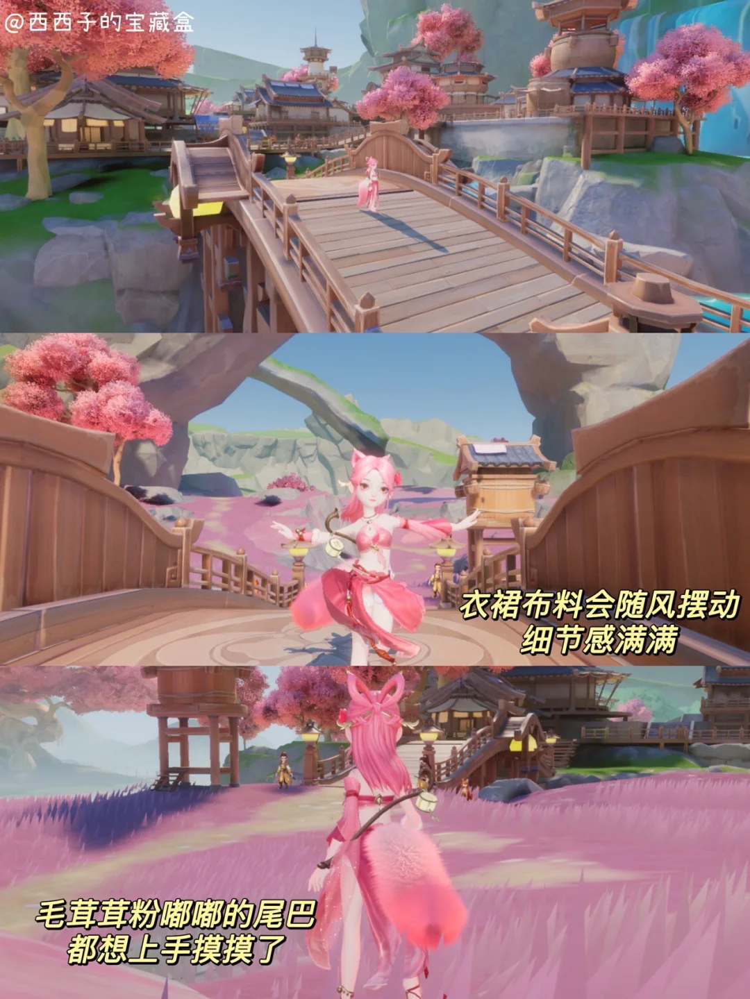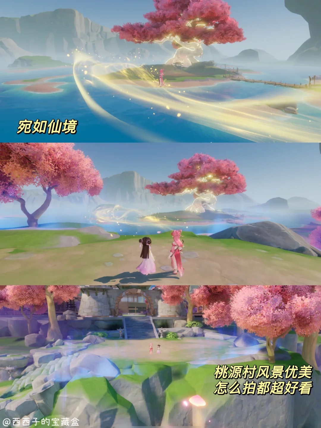 🌸游戏中的桃源村风景也超优美的,犹如梦幻世界,有很多粉色的桃花树,光影跟物品质感也是把控的恰到好处,