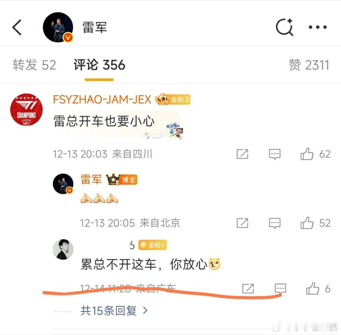 不喜欢雷军和小米,真心建议不要关注,不就好了。雷军发微博让大家开车小心,没见哪个企业家高管会有如此态度,评论区一位“粉丝”却不开心了。非要评论什么,累总不开这车,你放心。点开账号,看下资料,就算明白了。说真的,不喜欢别关注不好吗,都成金粉了。