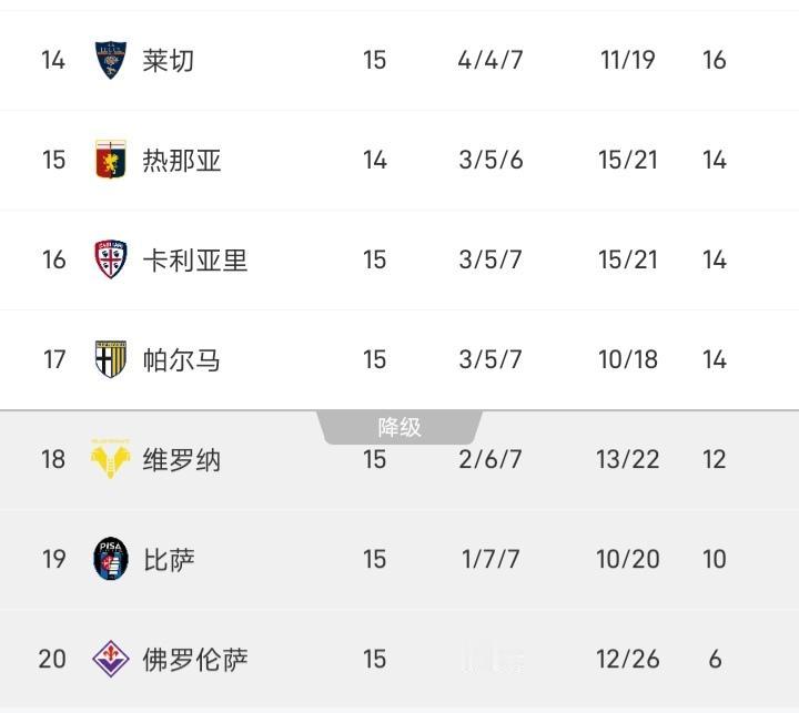 意甲倒数两名之战,没想到佛罗伦萨又输了,16轮过去,佛罗伦萨还没取得首胜,这战绩跟英超的狼队有得一拼,佛罗伦萨这个队内部问题看来挺多的。 主教练换成瓦诺利后,此人就带着球队在欧协赢了一场,联赛是一场不胜,佛罗伦萨还换主教练也是换了个寂寞。 佛罗伦萨上一次降级还是在2009年,当时降级并不是因为成绩不好,而是财务问题,但这一次离降级真的并不远了。 当然佛罗伦萨的总身价达到了2.8亿欧,而意甲身价最低的莱切却拿了16分,名列第14位,不得不说佛罗伦萨真降级的话,也算得上是身价最高的“降级队”了!