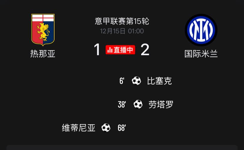 没让机会溜走,回到了属于自己的位置!意甲第15轮国际米兰客场2:1战胜热亚那,全取三分的国际米兰反超本轮战平的AC米兰1分,反超失利的那不勒斯2分登顶积分榜。比塞克远射首开纪录且成为球队联赛第13名破门的球员,队长劳塔罗传射建功且打进赛季联赛第8球。 本轮比赛前谁没想到面对弱旅且单线作战的AC米兰主场竟然丢分,同样卫冕冠军那不勒斯的居然也失利,给了国际米兰登顶的大礼包。 此次,国际米兰没有让机会溜走,但赢得坎坷。本场比赛可以看出恩里克还需继续提升,发挥确实一般;而苏西奇已经没有赛季初的灵性,除了跑动其他啥也没有了。另外齐沃的进场指挥确实看出了是菜鸟,还得继续提升。 不管怎样,国际米兰可以享受重新登顶积分榜第一的喜悦,后期的比赛继续再接再厉。