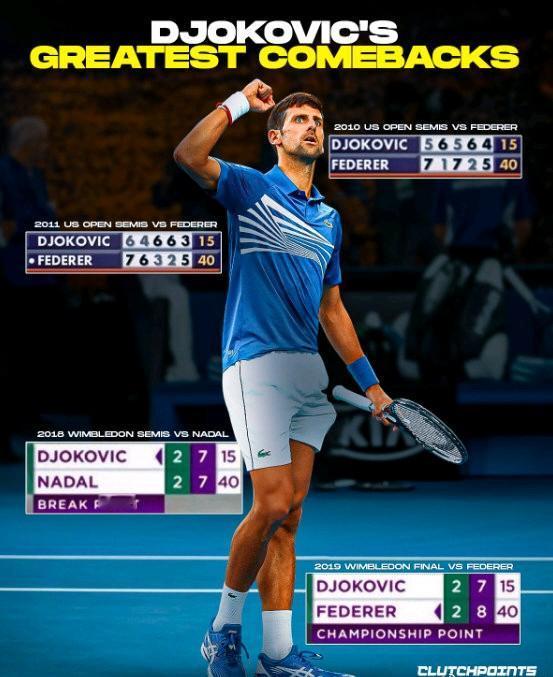2019年温网决赛,手握2个赛点并拥有发球权的费德勒被德约科维奇大逆转,从此心灰意冷直至退役。 德约科维奇的职业生涯在大型赛事中上演过无数次逆转,其中印象最深的是: 2010美网半决赛:3-2费德勒 2011美网半决赛:3-2费德勒 2018温网半决赛:3-2纳达尔 2019温网决赛:3-2费德勒