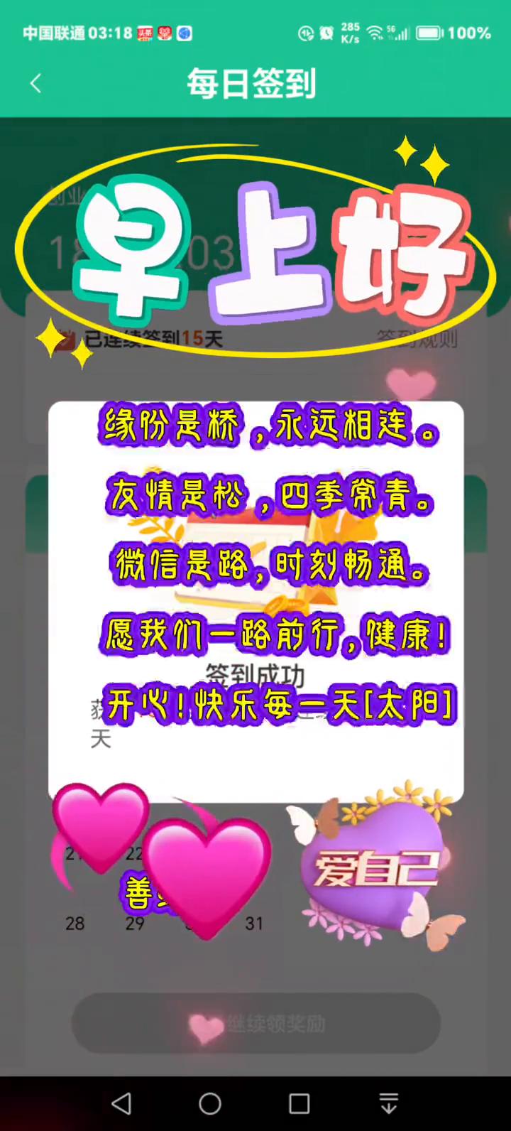 爱自己。 早上好,每日签到,签到成功,获得16个创业券,已连续签到15天,明天继续领奖励。缘份是桥,永远相连。友情是松,四季常青。微信是路,时刻畅通。愿我们一路前行,健康!开心!快乐每一天[太阳]。