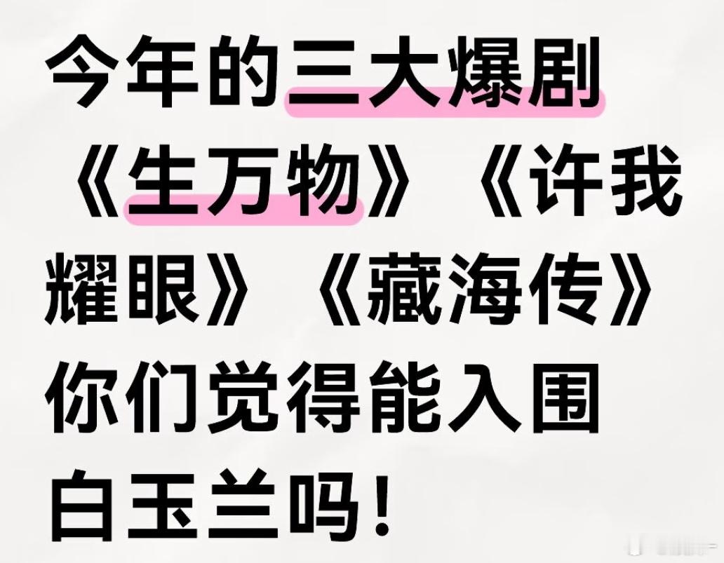 感觉生万物和藏海传应该会提名,许我耀眼题材可能不太行,国色芳华今年提过了,明年不太会二提
