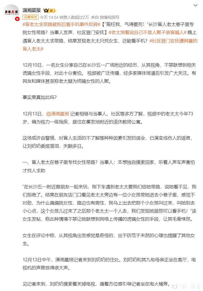 盲老太求带路被拒后看手机事件反转 我觉得这是一个很有难度的法律问题当事女生指责盲人老太是假盲人,是骗女生的人贩子,并且直接拍了抖音发网上直接导致当事老人被骂这个行为属于网暴造谣,还是“善意的提醒”?