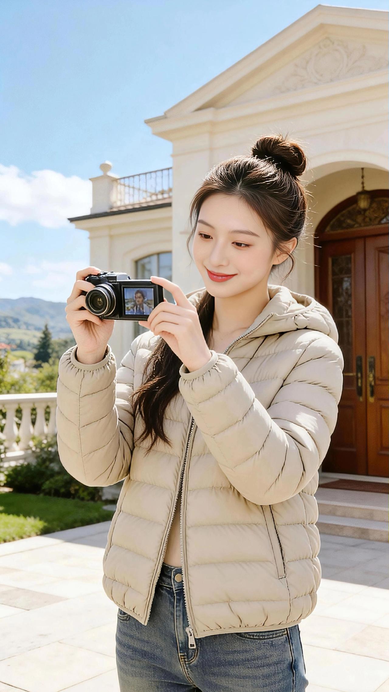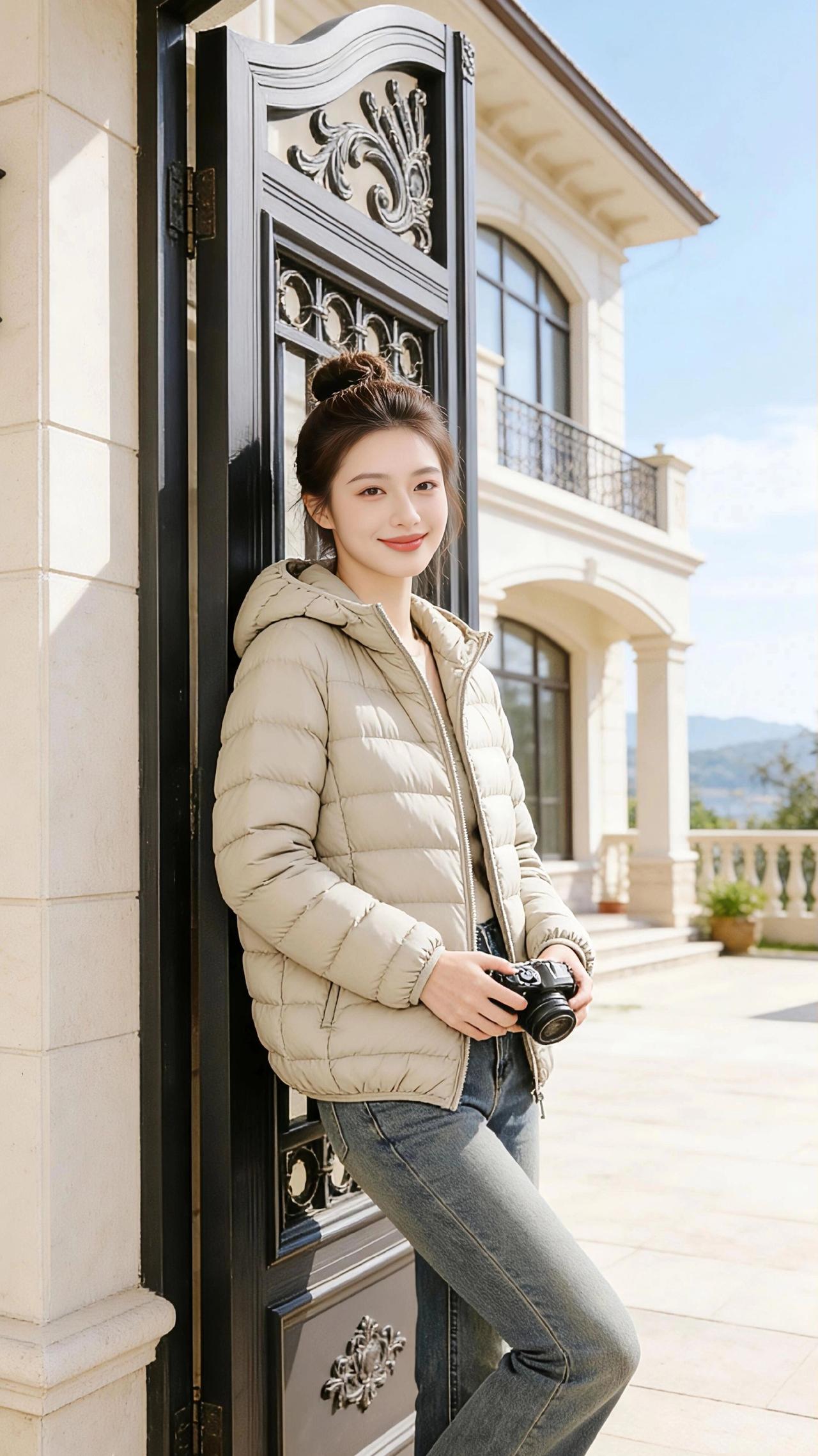 暖冬定格 晴日的风裹着浅淡的暖意,拂过米白色的建筑廊柱,也撩动了发梢的碎影。我拢了拢轻薄的羽绒外套,浅卡其的软质面料贴着肩背,像揣了一小团晒暖的云朵。 手中的相机被指尖稳稳托着,镜头对着澄澈的蓝天,又忽而转向自己。液晶屏里映出半扎的丸子头,映出唇畔的笑意,也映出身后欧式建筑的雕花门廊与远处的山影。抬手按下快门的瞬间,风恰好停了,阳光落在相机的金属机身上,跳脱成细碎的光斑。 倚着黑色铁艺门栏时,牛仔裤的磨白纹理蹭过冰凉的金属雕花,低头摩挲相机的皮质挂绳,忽然觉得冬日的美好从不是凛冽的,而是这样细碎的、可触碰的温柔——是羽绒的软,是阳光的暖,是按下快门时,把此刻的晴好妥帖收藏的欢喜。 转身靠在罗马柱上,指尖轻触冰凉的石材,回头望时,镜头又对准了这片藏着温柔的庭院。原来美好从不用刻意找寻,它就藏在暖冬的晴日里,藏在按下快门的每一个瞬间,藏在我们愿意停下来,好好看世界的眼眸中高级感穿搭 小个子穿搭 冬季穿搭