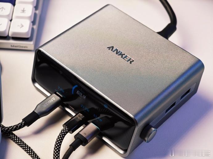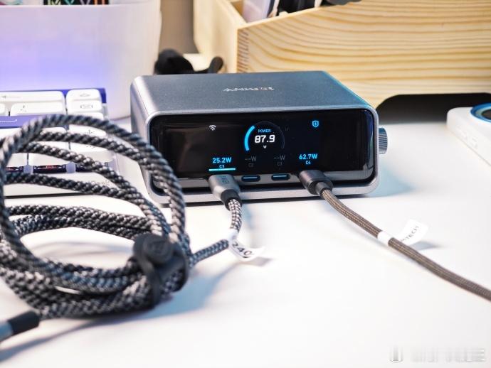 Anker Prime 250W 智能桌面充 Pro 上手作为常年被多设备充电线缠绕的用户,这款桌面充电站直接终结了桌面「线材大乱斗」!250W 氮化镓总功率搭配 4C+2A 六接口配置,实测同时喂饱 MacBook Pro(140W)、iPad Pro(30W)、iPhone 16 Pro Max(20W)、Switch(18W)和耳机(5W),功率动态分配丝滑不卡顿,总输出稳定在 223W 左右,全程机身温度控制在 41℃以内,温控表现相当靠谱。工业设计堪称桌面美学典范 —— 金属灰磨砂外壳质感拉满,搭配 2.3 英寸彩屏,既能实时显示各接口电压、电流数据,还能切换成数字时钟模式,往办公桌上一放,直接变身吸睛赛博摆件。智控旋钮与 APP 的联动堪称隐藏彩蛋!旋转切换 AI 动态分配、双笔记本模式时,屏幕动画反馈自带高端音响般的阻尼质感,手感超上瘾。通过 APP 还能远程关闭指定接口,出差时用手机一键切断笔记本充电,有种掌控数码能源中枢的未来感。散热设计也暗藏巧思,边缘蜂窝状散热孔搭配石墨烯导热层,高负载下也能冷静运行。对于追求效率与桌面秩序感的用户来说,这款产品重新定义了桌面充电的意义 —— 它不仅仅只是简单的供电工具,更是让数码生活更规整的智能控制终端~