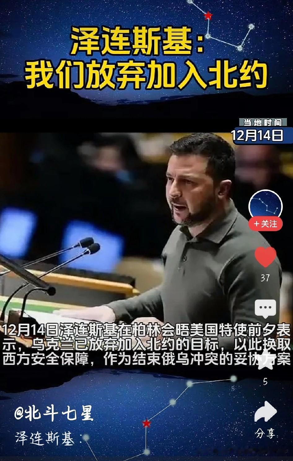 乌克兰放弃加入北约!这背后全是无奈 刚刷到泽连斯基的声明,乌克兰居然放弃加入北约了,这转变也太大了! 想当初俄乌冲突爆发,不就是因为乌克兰要加入北约,俄罗斯不同意嘛。现在打了快四年,泽连斯基终于松口,说不加入北约了,就想换西方给点安全保障,赶紧结束战争。 其实这也是没办法的事。美国现在不怎么援乌了,还逼着他谈判;欧洲那边也没力气帮了,国内老百姓更是早就不想打了,经济垮了,人也死伤不少。 说到底,小国夹在大国之间太难了。放弃入约不管是妥协还是务实,只希望这能让战火停一停,乌克兰的老百姓能早点过上安稳日子,别再遭罪了! 乌克兰放弃加入北约 俄乌冲突最新进展 泽连斯基:乌克兰已放弃加入北约 乌克兰 图片截图于网络