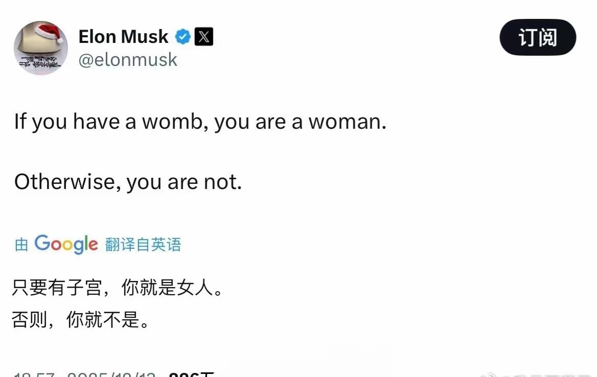 这个我赞马斯克,简单明了又准确,毫不拖泥带水! 只要有子宫你就是女人。否则,你就不是。 曾经看到有人调侃他喜得千金,还觉得好玩,但看到三观如此正的老马,实在没理由幸灾乐祸。