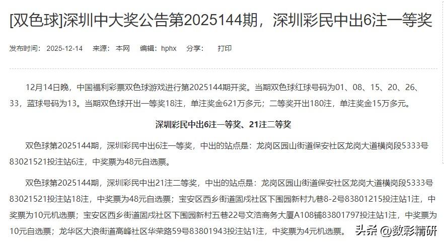 深圳一人独中6注头奖+18注2等奖揽获3999万,昨夜,双色球第25144期开奖揭晓,深圳成为最大赢家,据深圳福彩消息,深圳喜揽6注一等奖与21注二等奖。 头奖出自龙岗区园山街道保安社区龙岗大道横岗段5333号的83021521投注站。中奖票为一张48元自选票,不仅一举斩获6注一等奖,更同时中得18注二等奖,可谓鸿运当头、惊喜连连。 其余3注二等奖分别花落以下三处: 宝安区西乡街道固戍社区下围园新村九巷8-2号83801215投注站,中奖票为10元机选票; 宝安区西乡街道固戍社区下围园新村五巷22号文浩商务大厦A108铺83801797投注站,中奖票为10元自选票; 龙华区大浪街道高峰社区华荣路59号83801943投注站,中奖票为4元机选票。 若您恰在附近,不妨前往这些福地,感受一番强者的好运气息,沾沾喜气。愿幸运眷顾,或许下一个惊喜,正悄然向您走来。