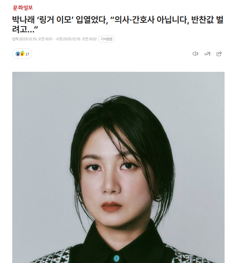 【朴娜莱的“点滴姨母”开口讲述内情:“不是医生护士,为了赚点小菜钱...”】海外新鲜事热点现场 因涉嫌对艺人朴娜莱进行非法医疗而被质疑的所谓“点滴大妈”A某表示“她为了赚点小菜钱(进行了医疗行为)”,但对于前经纪人主张的曾给朴娜莱打点滴一事,她回应称“完全不记得”。《文化日报》为了确认朴娜莱接受非法医疗的嫌疑,于本月10日尝试通过电话联系了A某。此前,朴娜莱的前经纪人表示“2023年7月拍摄结束后,在金海酒店,有陌生人给(朴娜莱)打过点滴”,并公开了与A某来往的短信内容。该短信包含了朴娜莱疑似停留过的酒店地址、治疗费用、A某的账户号码及汇款情况等对话内容。对于短信中留有的自己的姓名、银行名、账户号码,A某确认“是我的号码没错”,但当被问及当时是否对朴娜莱进行了医疗行为时,她回答“完全不知道”。另外,当被问及“知道朴娜莱是谁吗?”时,她回答“嗯,是笑星”,但关于朴娜莱是否接受了非法诊疗,她反复主张“完全不记得了”。还确认了A某并非医生或护士等持有许可的医疗人员。当被问及是否取得了医疗执照时,A某回答“不是不是,完全不是”,并表示“在医药分业之前,我在医院工作过一段时间,在社区的药店(把药)送过去,赚点小菜钱。后来不干了,就什么都没做了。”此外,关于是否持续进行非法医疗行为,A某表示“医药分业之后因为没有药了,就完全没做了”,并补充说“(不干)很久了。年纪也大了,我视力也不好等等...”今后的争议点预计将集中在朴娜莱是否知晓“点滴大妈”A某并非医疗人员这一点上。如果朴娜莱是相信A某是医疗人员而接受了诊疗,则有可能不受处罚。这与最近处于另一争议中心的“注射大妈”B某给组合SHINee成员温流进行诊疗后,温流解释称“2022年4月为了皮肤管理首次访问了位于首尔新沙洞的医院,考虑到当时医院的规模等,难以认识到目前在网上爆发的医疗执照争议”是同一脉络。但是,本月13日,Channel A报道称,朴娜莱于2023年11月参加MBC综艺《我独自生活》台湾拍摄时,与B某同行,期间朴娜莱表示“这个有问题”“希望韩国不要知道”“公司也绝对不能知道”,显示出她本人认识到这可能会成为问题,并让包括经纪人在内的周围人员封口的情况已得到确认。关于此次争议,虽然向朴娜莱方面询问了立场,但对方并未表明特别立场。