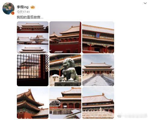 李现拍雪后的故宫李现晒雪后的故宫14日,晒自己拍的雪后故宫图,好美!此前,有多位网友表示在故宫偶遇了“摄影师”李现。这就来交功课了,好乖巧!