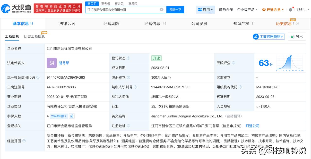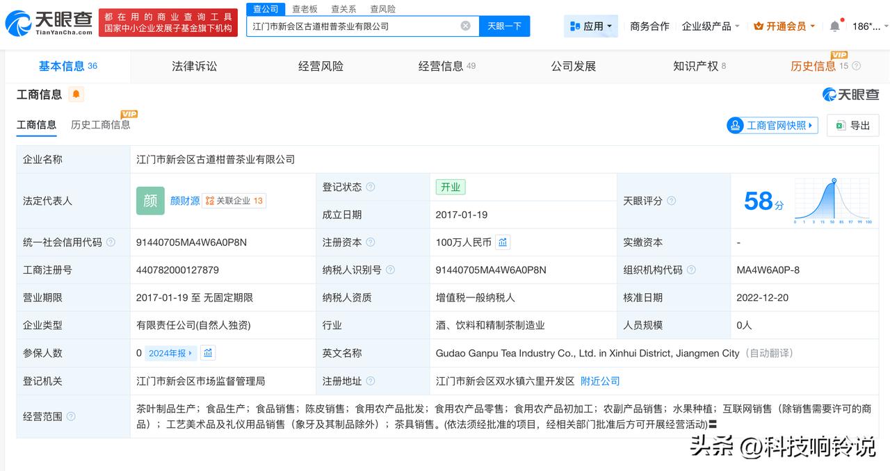 【揭秘暴利假陈皮关联公司 暴利假陈皮关联公司成立仅2年】央视曝光20倍暴利假陈皮 据报道,接到群众举报,反映陈皮市场存在年份虚标、产地及工艺造假等问题,关联公司涉及江门市新会懂润农业有限公司、江门市新会区古道柑普茶业有限公司。 天眼查工商信息显示,涉事公司江门市新会区古道柑普茶业有限公司成立于2017年1月,法定代表人为颜财源,注册资本100万人民币,经营范围包括茶叶制品生产、食品生产、食品销售、陈皮销售等。股东信息显示,该公司由颜财源全资持股。此外,涉事公司江门市新会懂润农业有限公司成立于2023年2月,法定代表人为胡月琴,注册资本300万人民币,经营范围包括新会柑种植、新会柑销售、陈皮销售、食品销售等。股东信息显示,该公司由胡月琴、梁家焕共同持股。 天眼查信息: