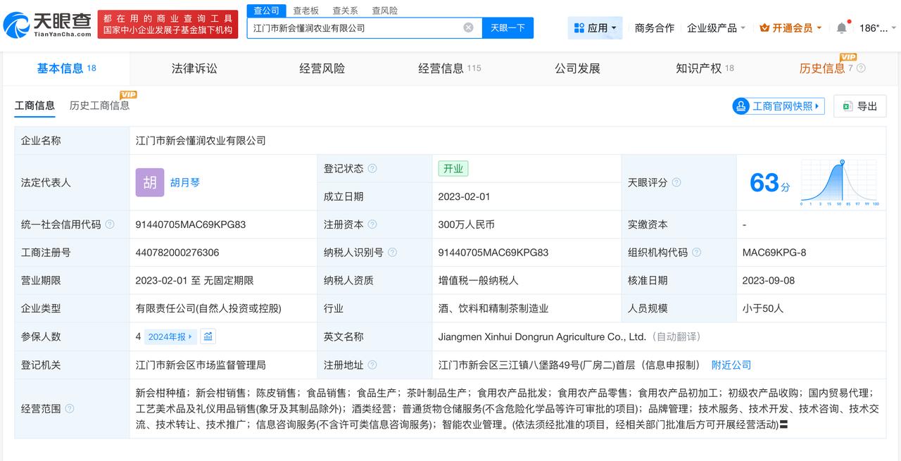 揭秘暴利假陈皮关联公司 暴利假陈皮关联公司成立仅2年央视曝光20倍暴利假陈皮 据报道,接到群众举报,反映陈皮市场存在年份虚标、产地及工艺造假等问题,关联公司涉及江门市新会懂润农业有限公司、江门市新会区古道柑普茶业有限公司。 天眼查工商信息显示,涉事公司江门市新会区古道柑普茶业有限公司成立于2017年1月,法定代表人为颜财源,注册资本100万人民币,经营范围包括茶叶制品生产、食品生产、食品销售、陈皮销售等。股东信息显示,该公司由颜财源全资持股。此外,涉事公司江门市新会懂润农业有限公司成立于2023年2月,法定代表人为胡月琴,注册资本300万人民币,经营范围包括新会柑种植、新会柑销售、陈皮销售、食品销售等。股东信息显示,该公司由胡月琴、梁家焕共同持股。 天眼查信息: