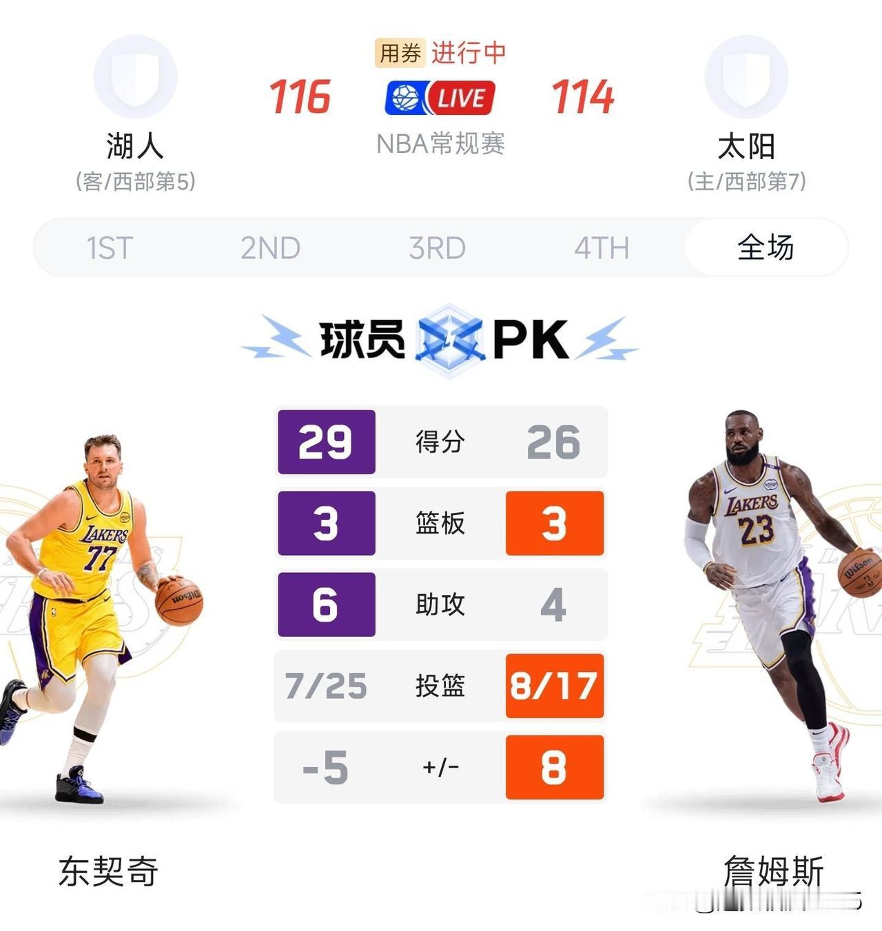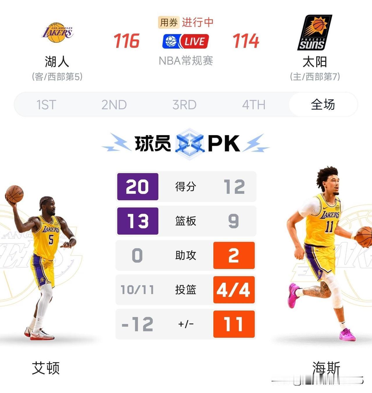 湖人差点阴沟翻船,最后4分钟太阳打出19:4的攻击波114:113实现反超,比赛还剩3秒时詹姆斯三分投篮犯规,靠罚球才锁定胜局。 看湖人比赛真要备好速效救心丸,第四节湖人最多领先达20分,最后250秒太阳打出进攻高潮,114:113反超了比分,詹姆斯最后一攻被犯规,3罚2中。太阳最后一攻被詹姆斯封盖,湖人抢下防守篮板,太阳无奈只有犯规,湖人2罚一中116:113艰难复仇太阳。 此战里夫斯缺战,詹姆斯增加了持球攻,效果OK,全场比赛17投8中砍下26分,另有3板4助2次封盖。东契奇今天三分线手感冰凉,12投仅2中还出现6次失误,虽砍下29分,但正负值为-5。艾顿一如既往的“两双”,20分13板,替补登场的海斯4投4中,得到12分9板。 湖人今日能复仇太阳,重新进入轮换阵容的范德比尔特功不可没,他对布克的防守非常到位,湖人教练真不该DNP范德彪,没防守的球队真的走不远。 湖人战绩变为18胜7负,排名反超马刺重回西部第四。