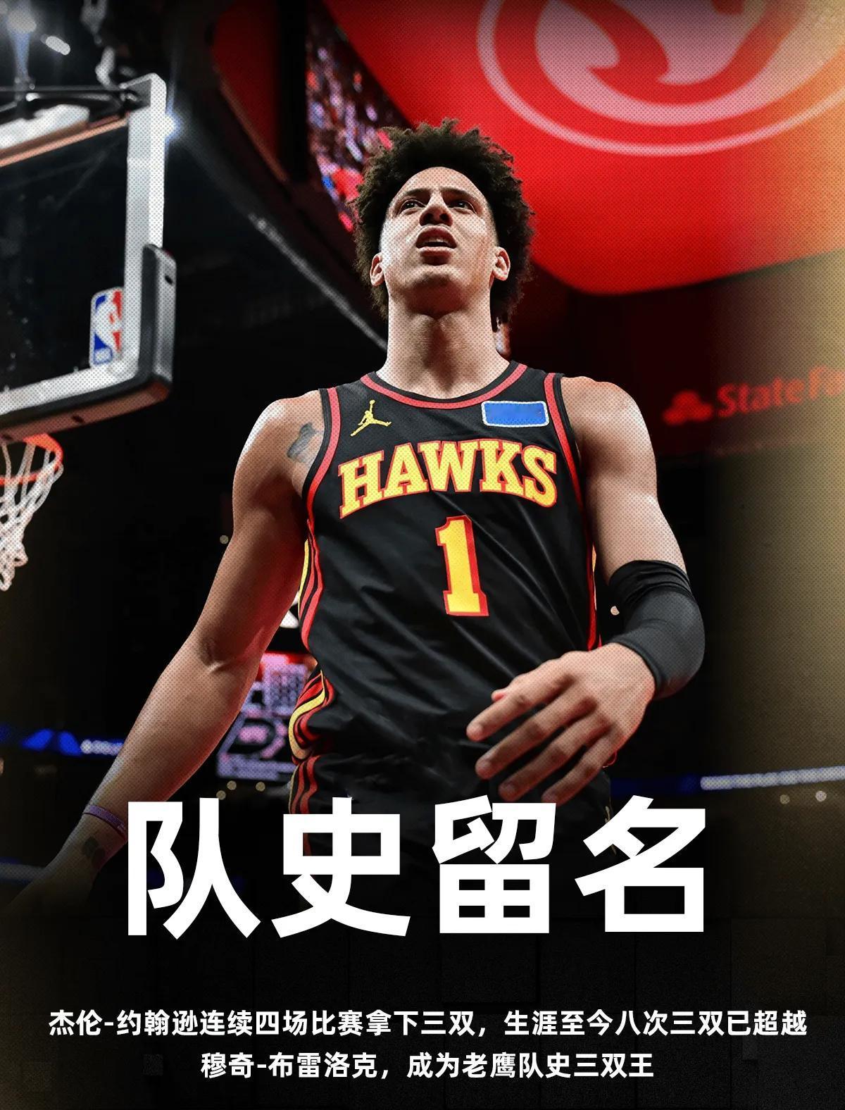 这么快杰伦·约翰逊就已经成为队史三双王了! 一方面是感慨老鹰祖上是真不富裕啊,一方面也让人感慨“江山代有才人出”啊,杰伦·约翰逊确实挺厉害的,已经连续4场拿到三双了,今天是他个人职业生涯的第8次三双,也让他超越穆奇·布雷洛克,成为老鹰队史三双王…… 感觉现在的“三双”越来越常见了,记得当年看杂志和报纸的时候,哪个球员要是能三双,都是要大篇幅大夸特夸一下的。而且现在的“助攻”也比以前容易了,以前是接球投篮得分才叫助攻,现在球传给你边跑边运进球都算助攻了