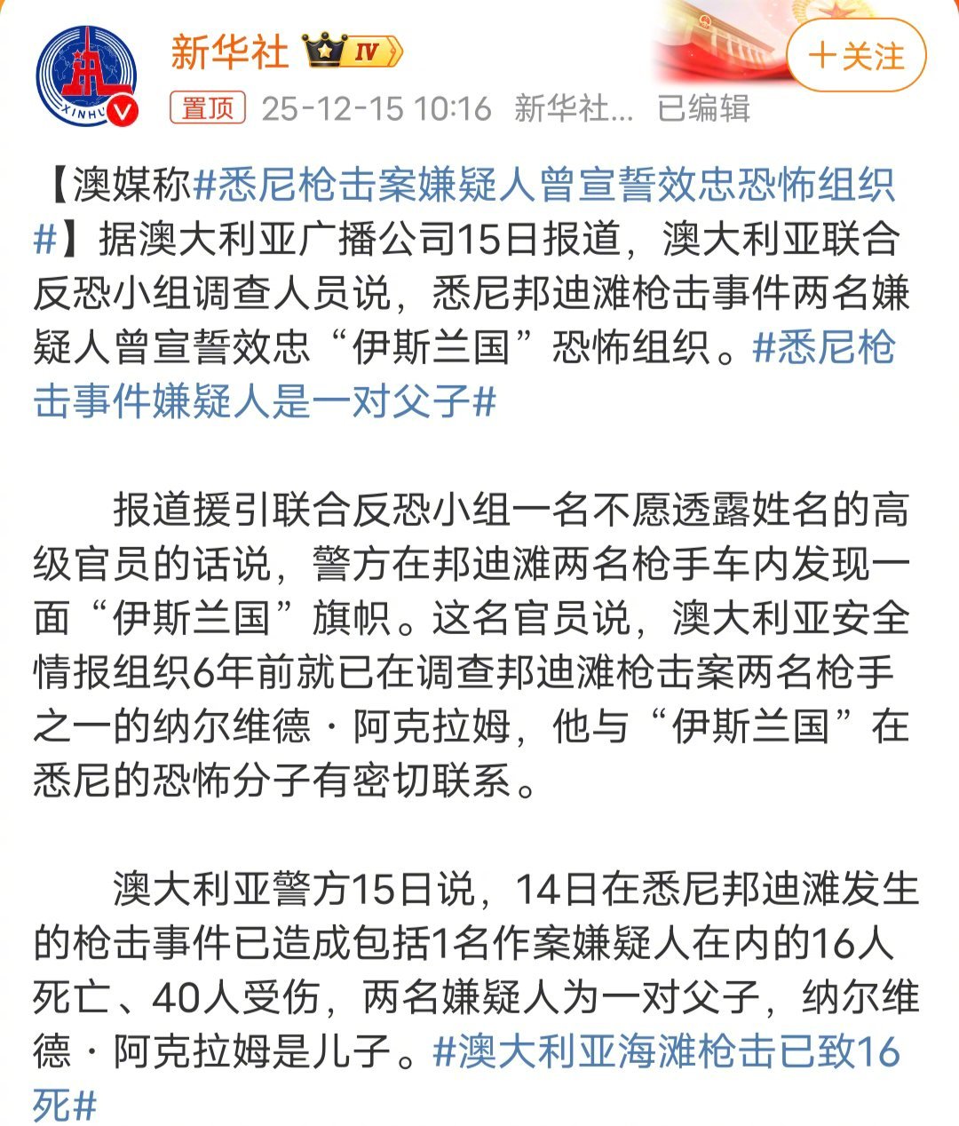 澳大利亚海滩枪击已致16死澳大利亚安全情报组织6年前就已在调查邦迪滩枪击案两名枪手之一的纳尔维德·阿克拉姆……这么说的话,这次枪击案是澳大利亚全责,你调查了6年不把人抓起来,这次枪击原本是可以避免的,澳大利亚有点故意纵容枪手的嫌疑,澳大利亚必须向以色列道歉。
