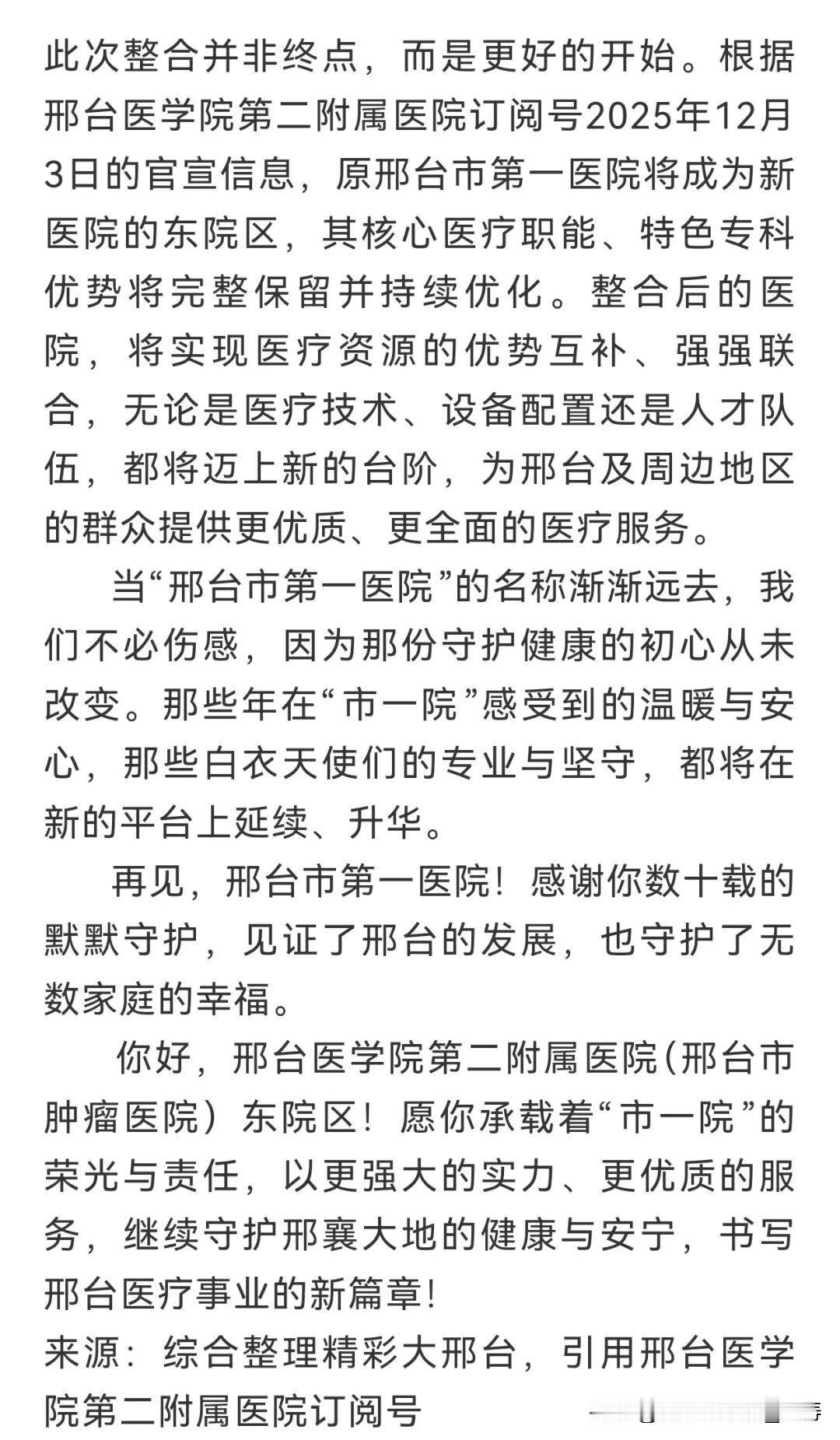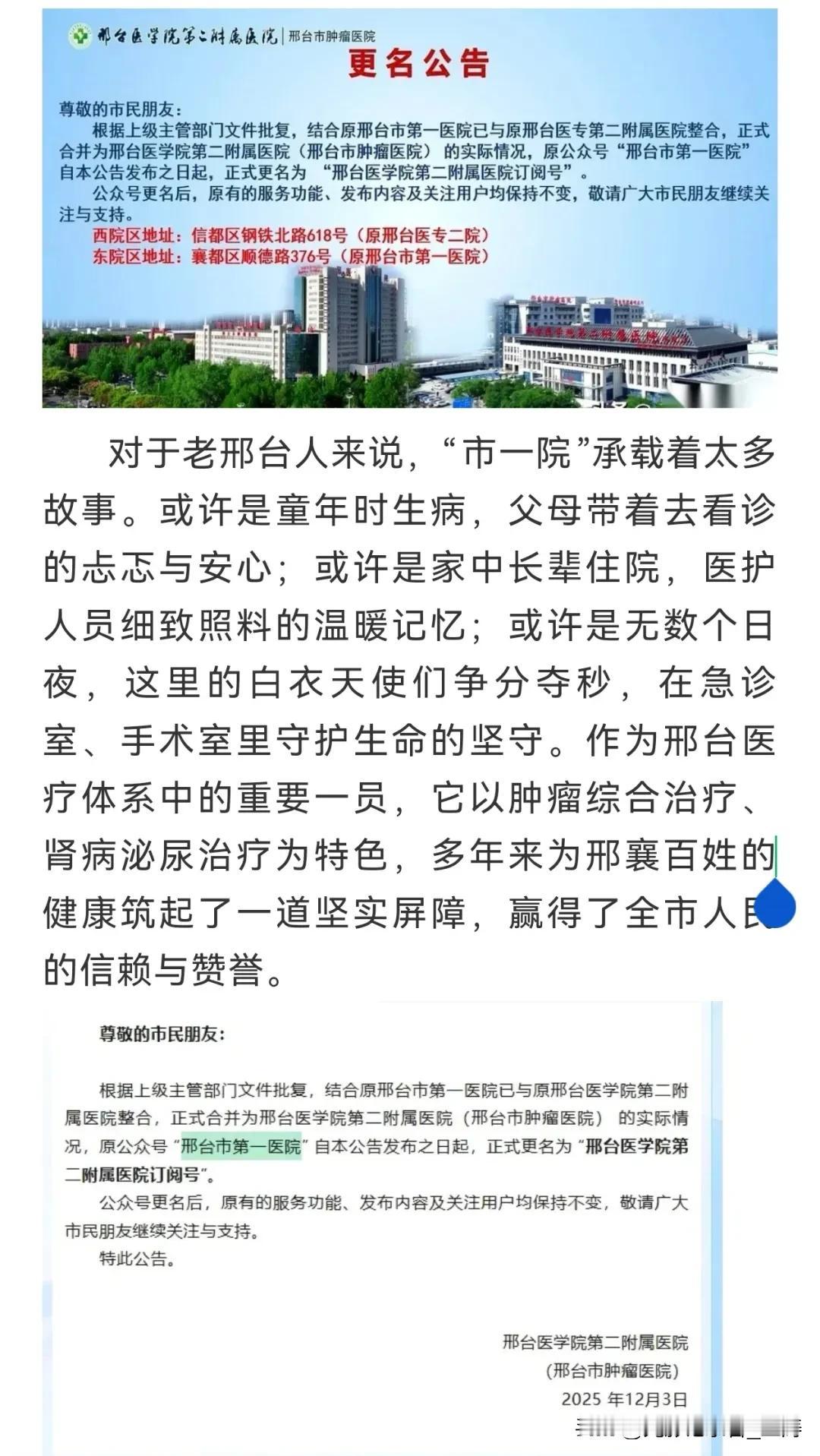 “市一院”,这三个字对于邢台人而言,早已不只是一家医院的简称,更是刻在几代人记忆里的健康守护符号。然而近日,一则官宣消息让无数邢台人感慨万千——原邢台市第一医院与原邢台医学院第二附属医院正式整合,合并为邢台医学院第二附属医院(邢台市肿瘤医院),“邢台市第一医院”的名称就此成为历史。