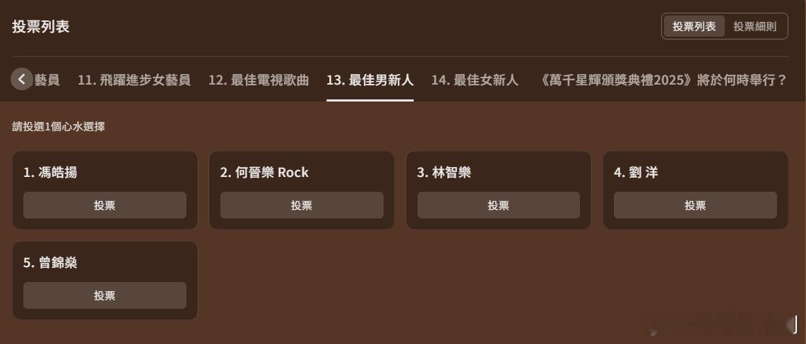 万千星辉颁奖典礼2025丨最佳男、女新人最后十强最佳男新人:1. 馮皓揚2. 何晉樂 Rock3. 林智樂4. 劉 洋5. 曾錦燊最佳女新人1. 陳若思2. 莊子璇3. 倪嘉雯4. 姚焯菲5. 詹天文TVB