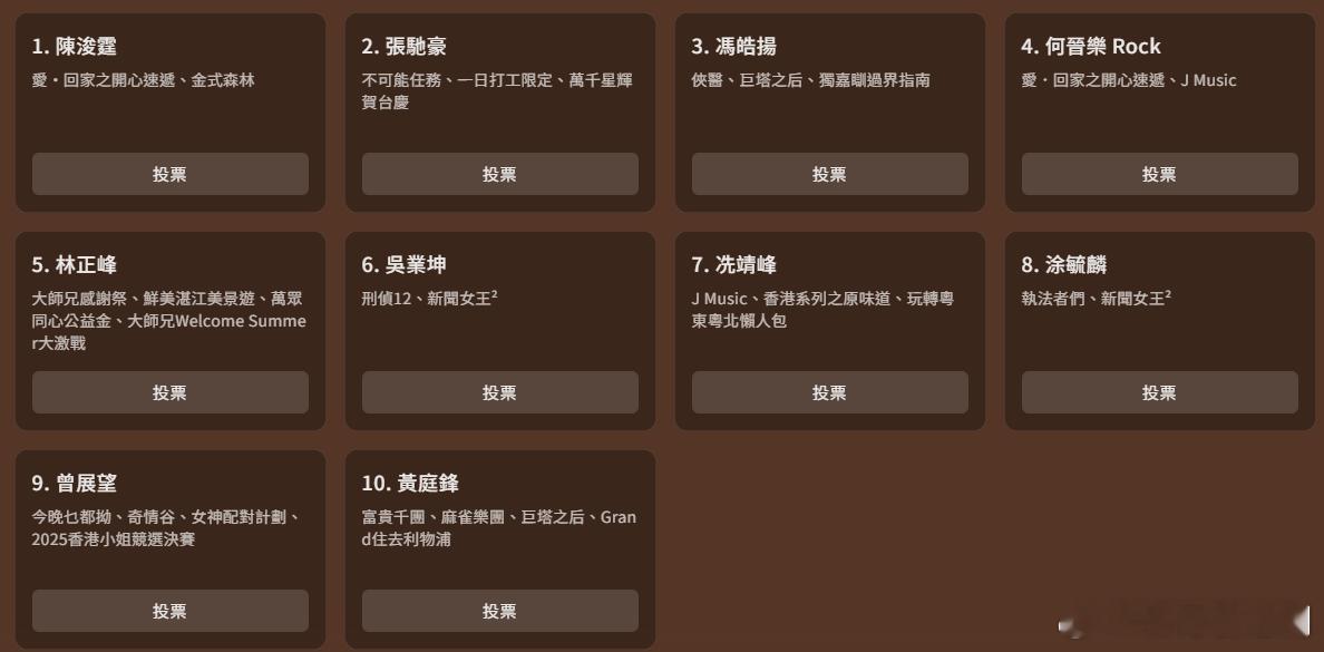 万千星辉颁奖典礼2025丨飞跃进步男、女艺员最后十强飞跃进步男艺员最后十强陳浚霆張馳豪馮皓揚何晉樂 Rock林正峰吳業坤冼靖峰涂毓麟曾展望黃庭鋒飞跃进步女艺员最后十强陳禎怡何沛珈關嘉敏林秀怡李芷晴梁凱晴倪嘉雯戴祖儀王嘉慧葉蒨文TVB